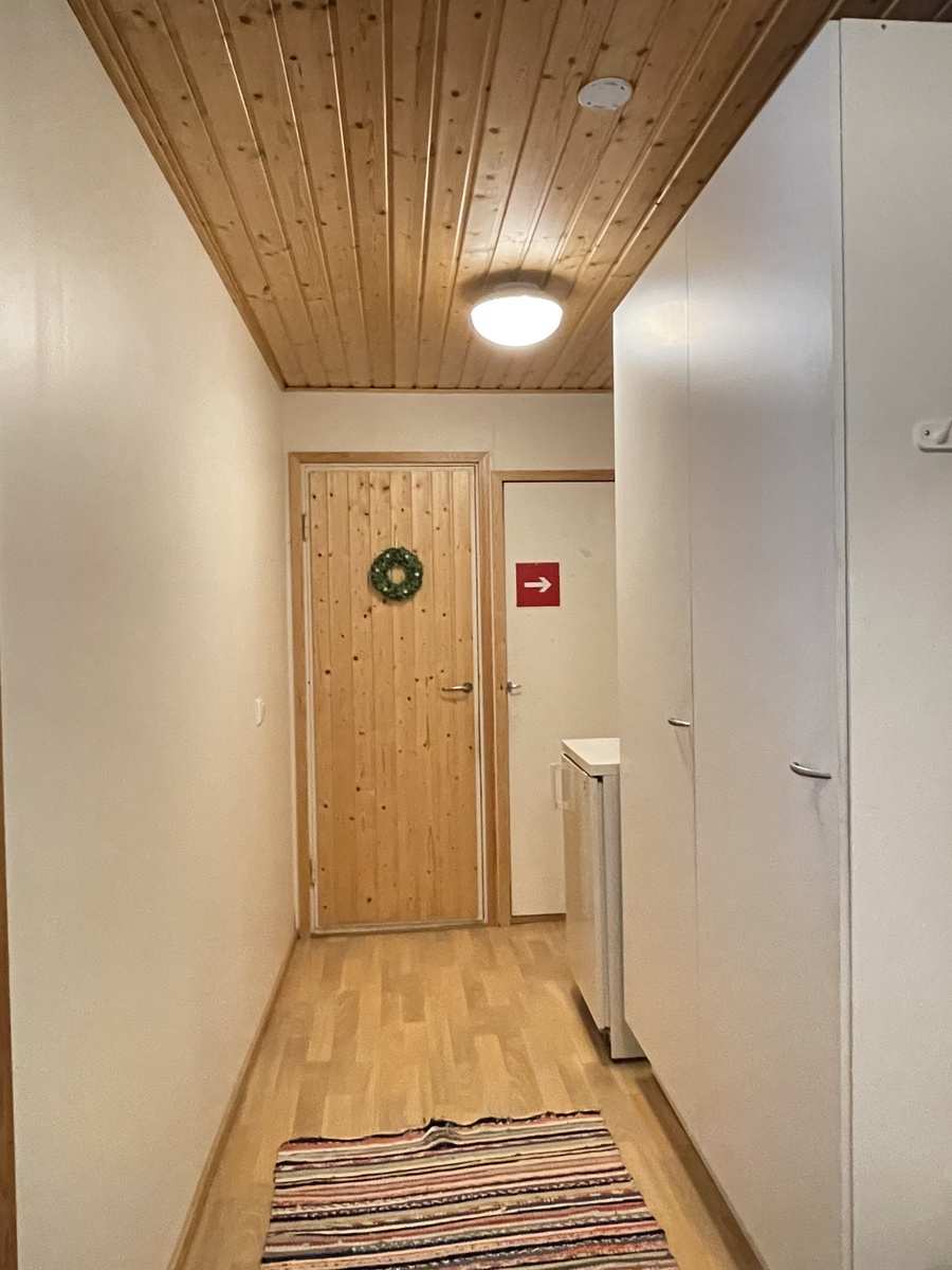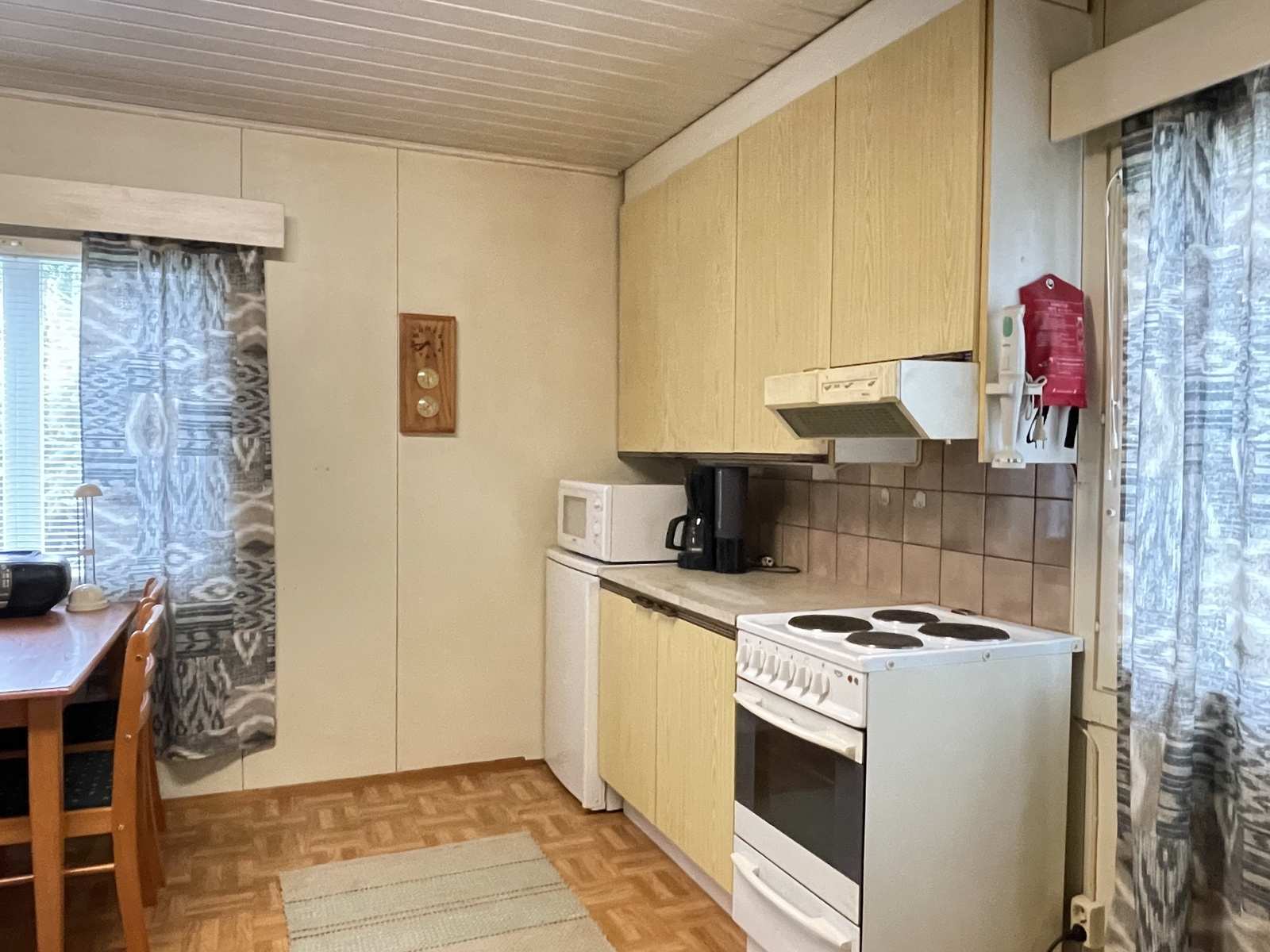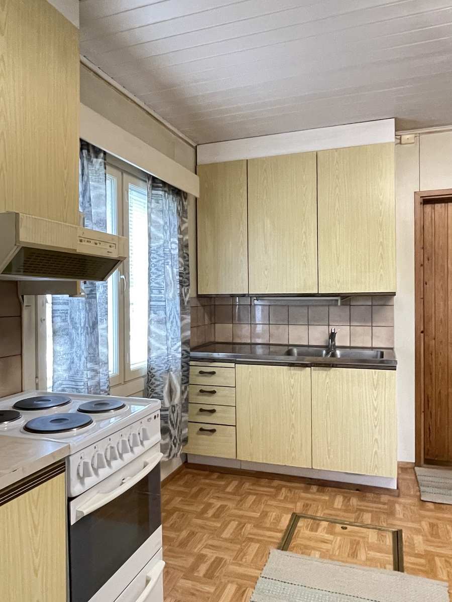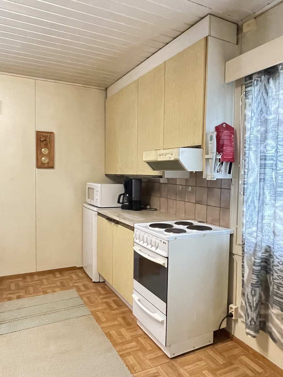 | Keittiön varustus | Jääkaappi ja pakastin: jääkaappi Muut varusteet: liesituuletin, irralliset kaapistot, kiinteät valaisimet Seinät: maalattu Lattia: muovi Liesi/uuni: sähköliesi |
