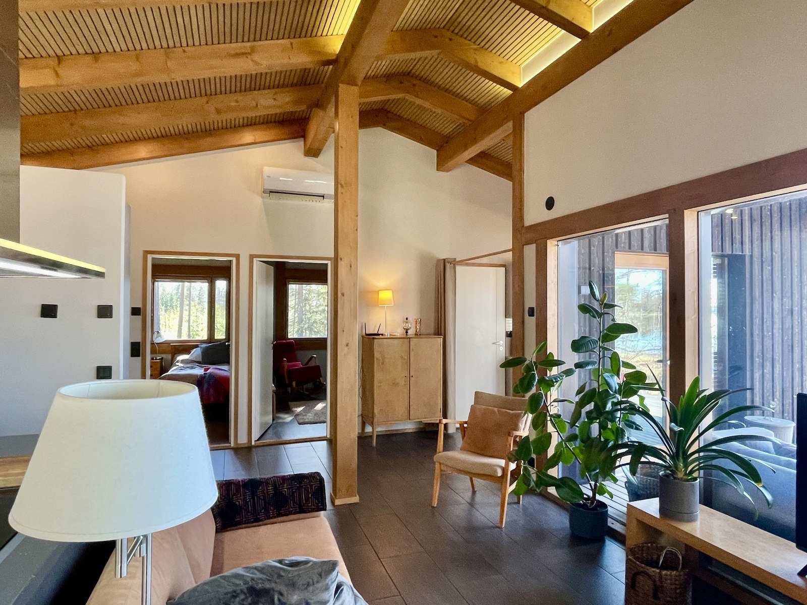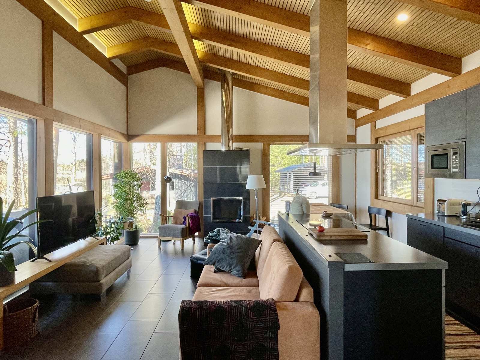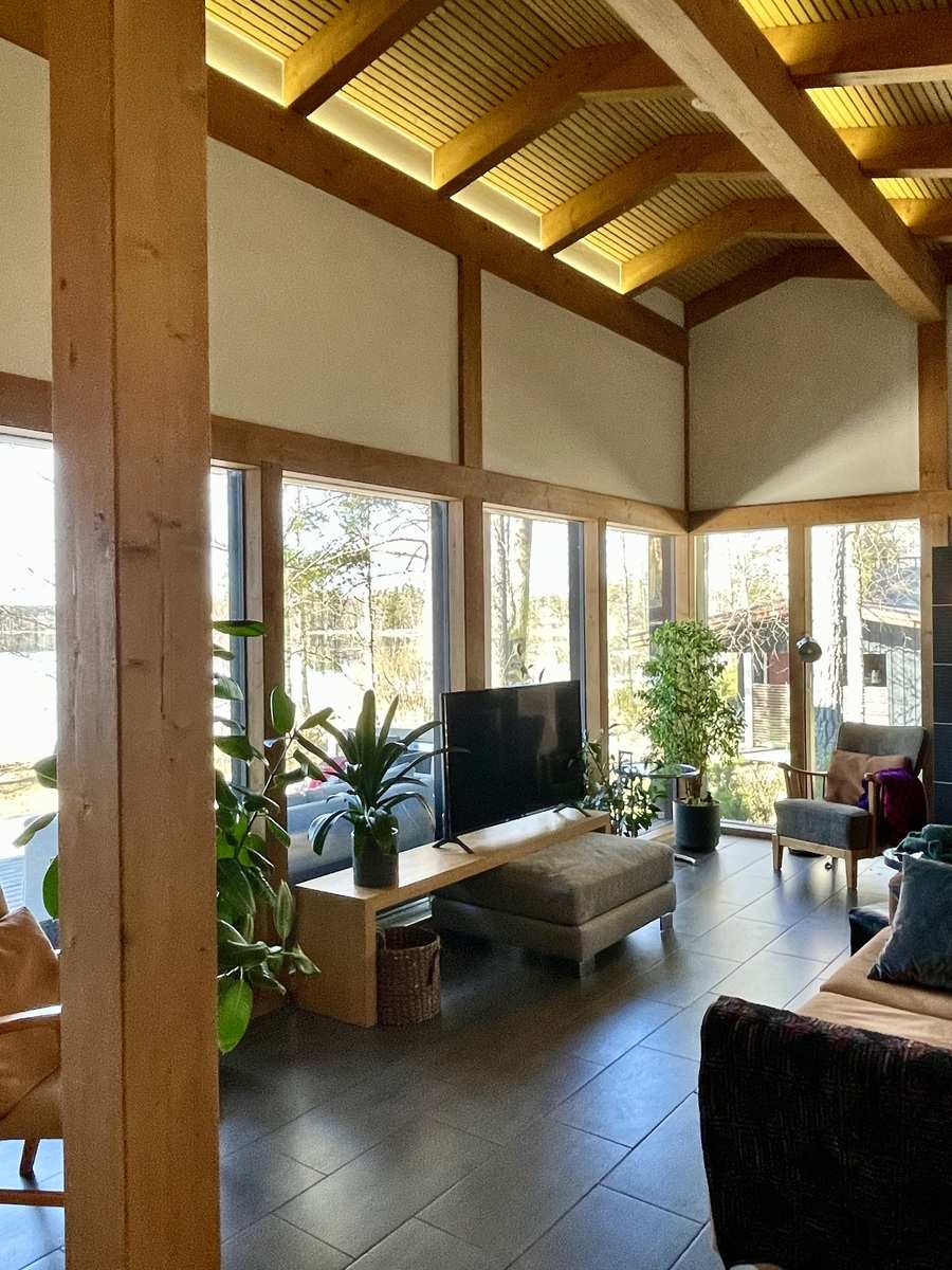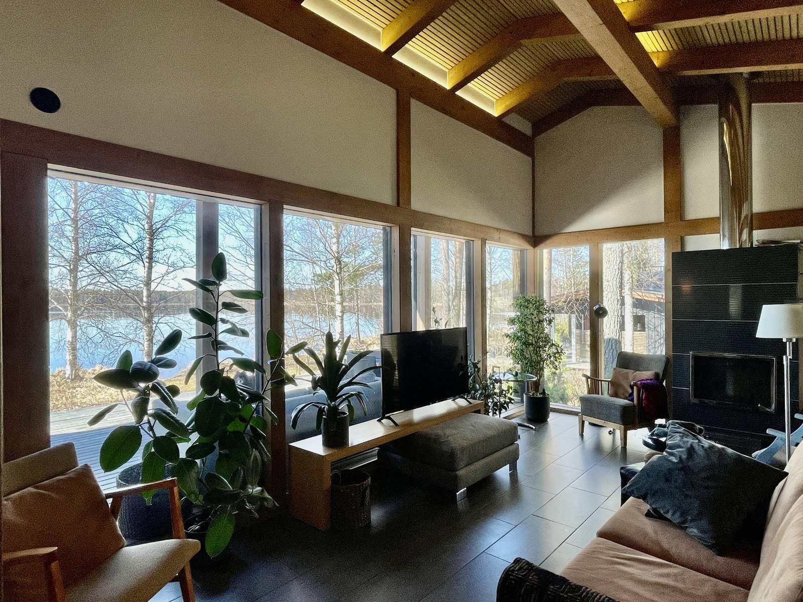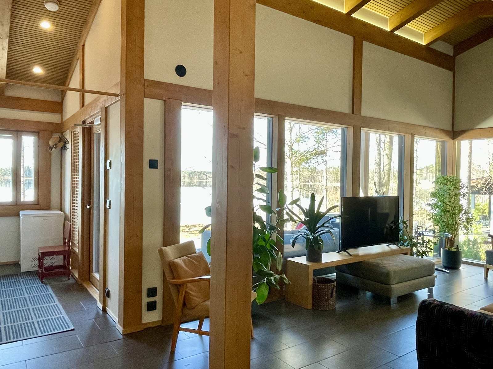 Sisustus on harmoninen ja lämminsävyinen. Sisäkatoissa on komeat kattovasat ja niiden välissä valeurapaneelit, jotka tuovat puun lämpöä vaaleiden seinien rinnalle. Keittiökaapistot on Puustellin mallistosta ja olohuoneessa on Uuniseppien Riekko-takka. Makuuhuoneiden lattiat ovat Kährsin tammiparkettia, muut lattiat on laatoitettu. Ulkovuoraus on pystypaneelia ja sävytetty mustaksi. Lämmityksenä on suora sähkölämmitys lattialämmityksenä ja ilmalämpöpumpulla, järven puoleisissa ikkunoissa on lisäksi sähkölämmitys.