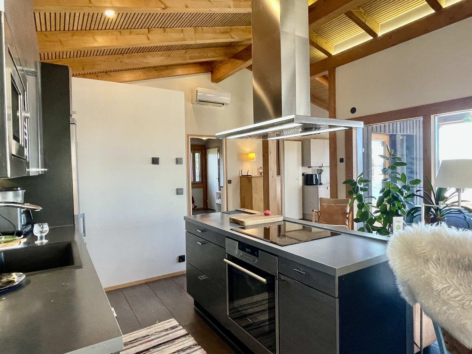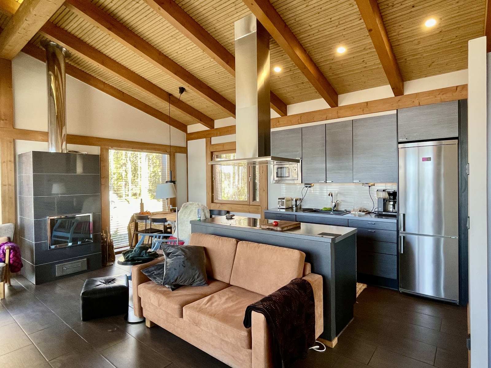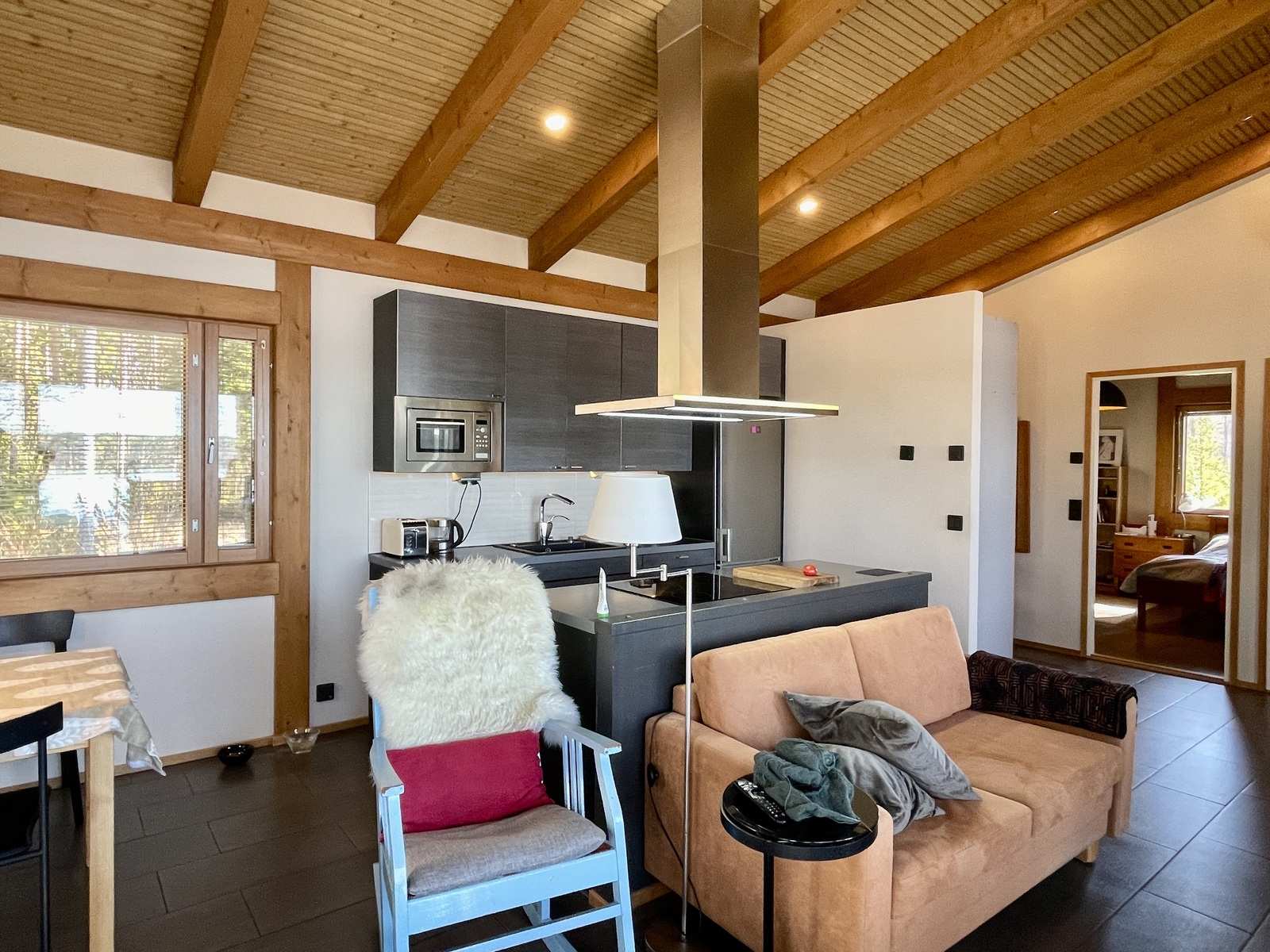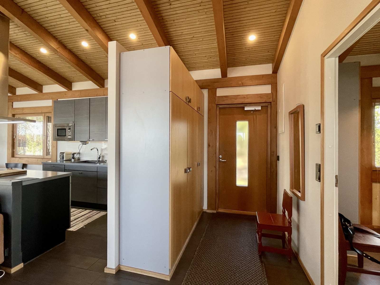 Sisustus on harmoninen ja lämminsävyinen. Sisäkatoissa on komeat kattovasat ja niiden välissä valeurapaneelit, jotka tuovat puun lämpöä vaaleiden seinien rinnalle. Keittiökaapistot on Puustellin mallistosta ja olohuoneessa on Uuniseppien Riekko-takka. Makuuhuoneiden lattiat ovat Kährsin tammiparkettia, muut lattiat on laatoitettu. Ulkovuoraus on pystypaneelia ja sävytetty mustaksi. Lämmityksenä on suora sähkölämmitys lattialämmityksenä ja ilmalämpöpumpulla, järven puoleisissa ikkunoissa on lisäksi sähkölämmitys.