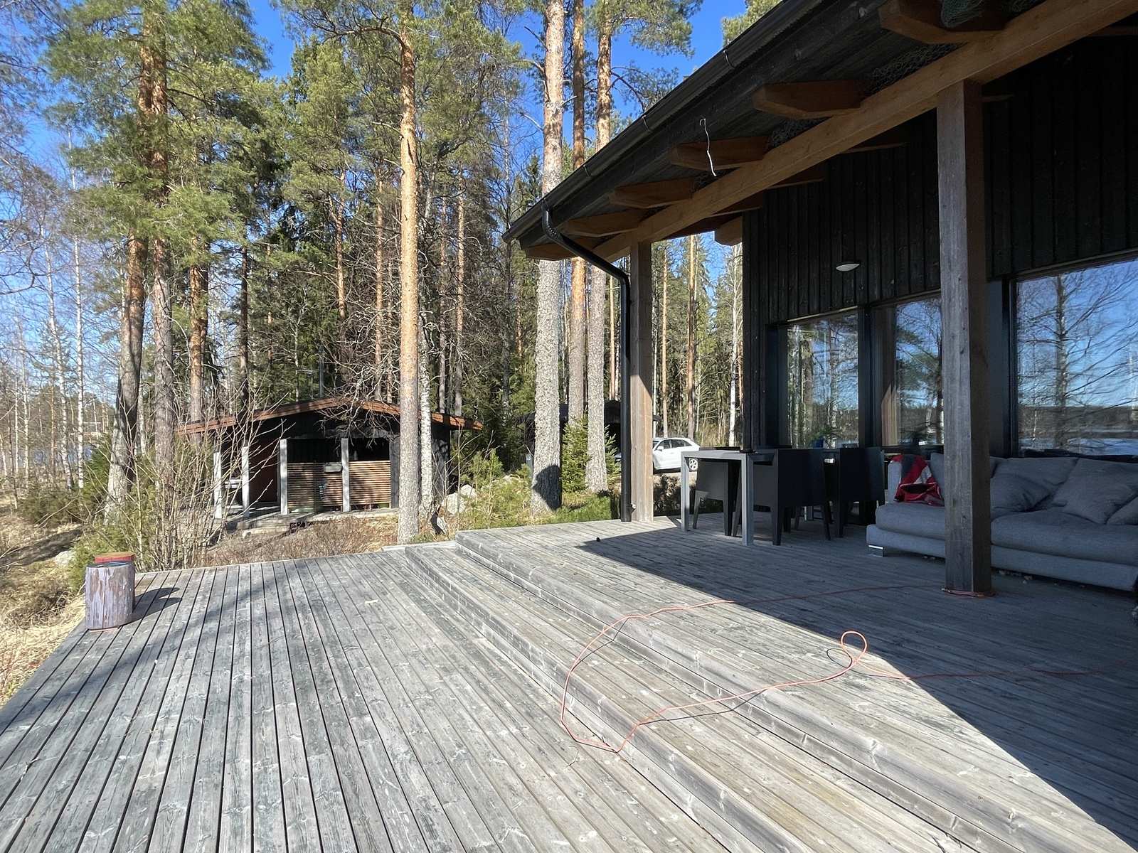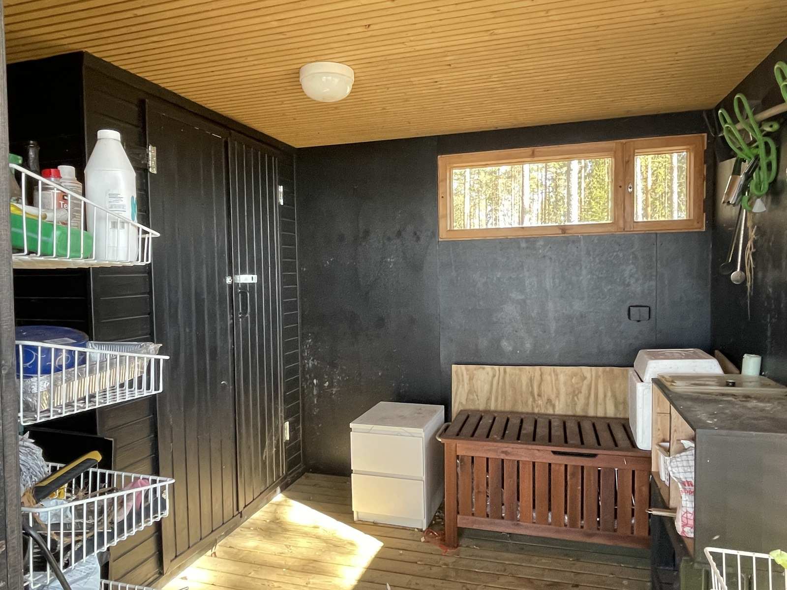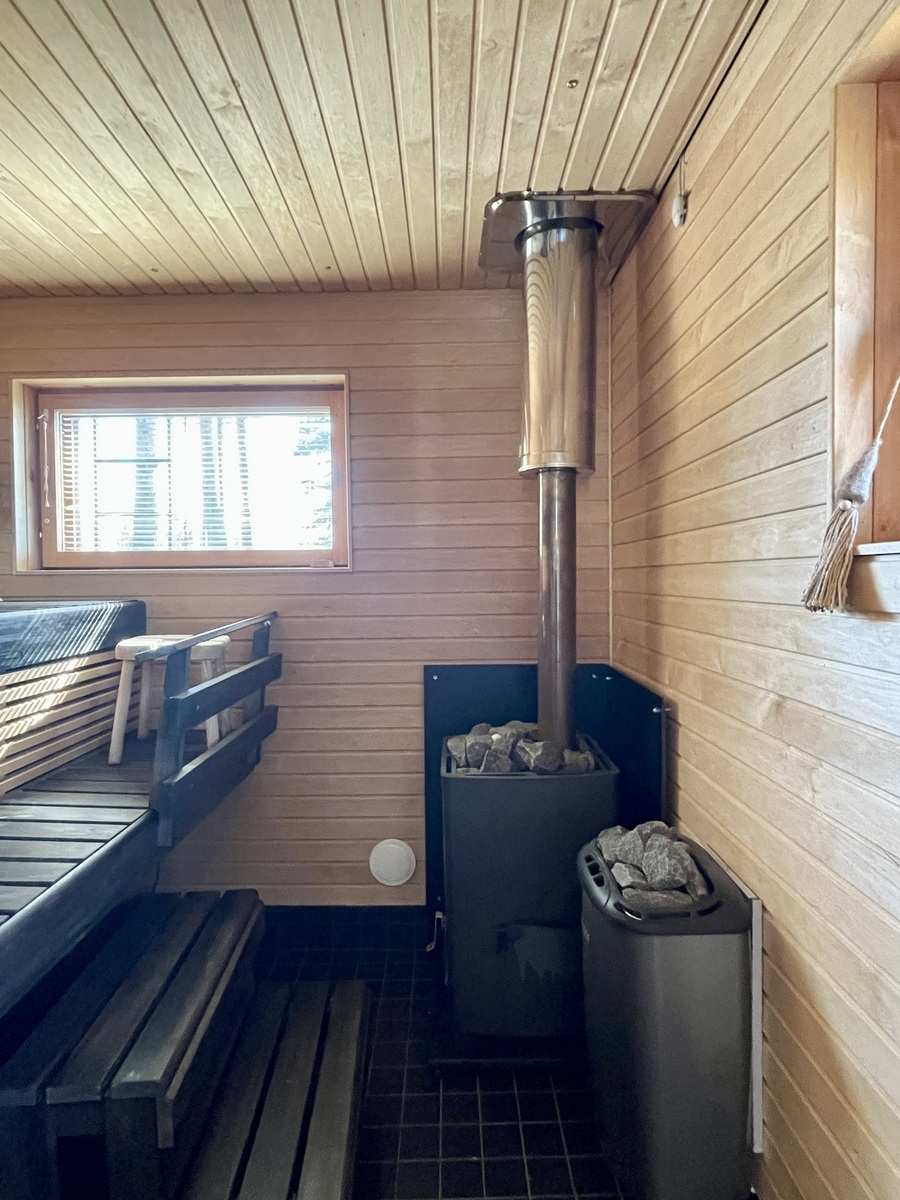 | Saunan kuvaus | Saunassa on sekä puulämmitteinen kiuas että sähkökiuas. Katossa olevat halogeenivalot ei toimi enää. |