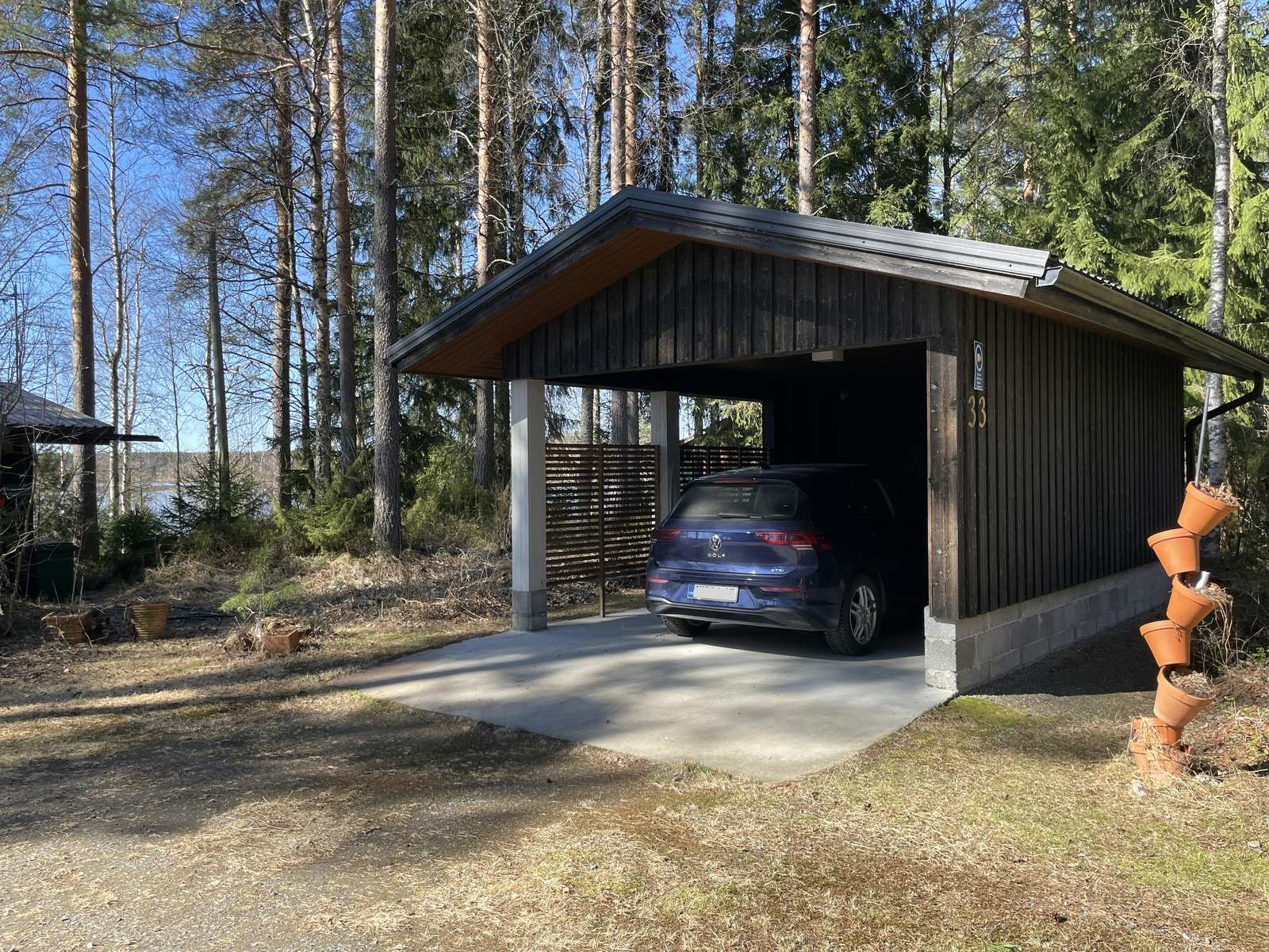 Tontilla ollut vanha mökki on peruskorjattu huvilan rakennusaikaan varastoksi ja kesäkeittiöksi ja rakennuksen ulkonäkö on yhtenäistetty uuden huvilan kanssa. Autokatos on rakennettu tyyliin sopivaksi samaan aikaan huvilan kanssa.