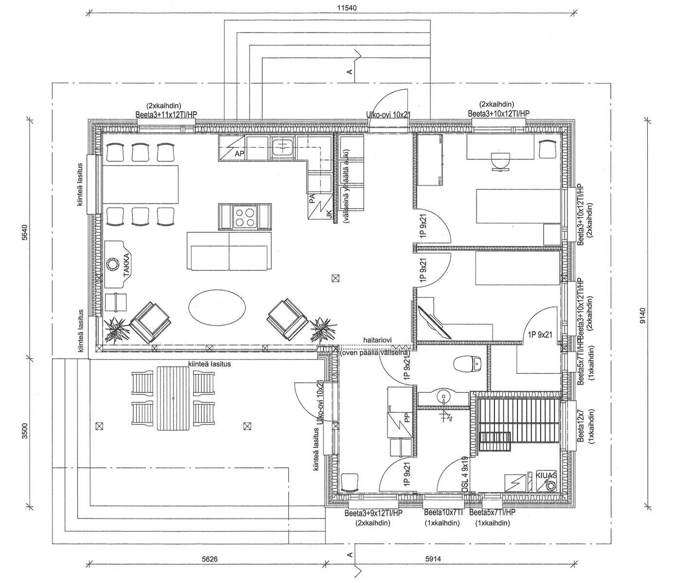 - Tupakeittiö + 2 mh + vh + s + ph +pkh + wc