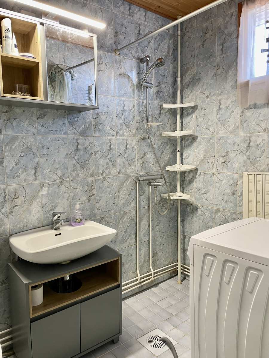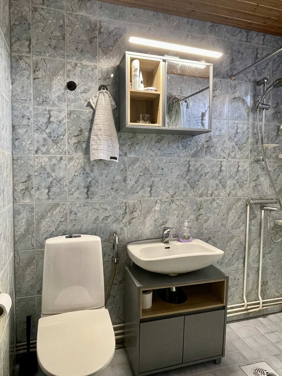 | Kylpyhuone | Varusteet: pesukoneliitäntä, wc-istuin, suihku, peilikaappi, kiinteät valaisimet Seinät: kaakeli Lattia: laatta |