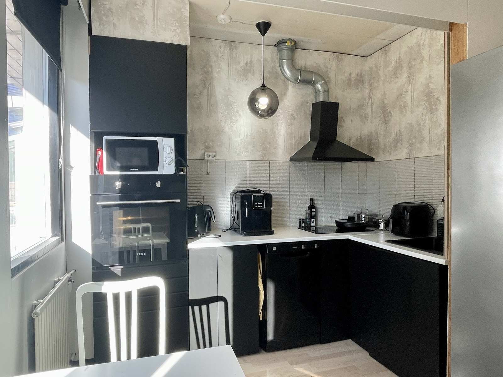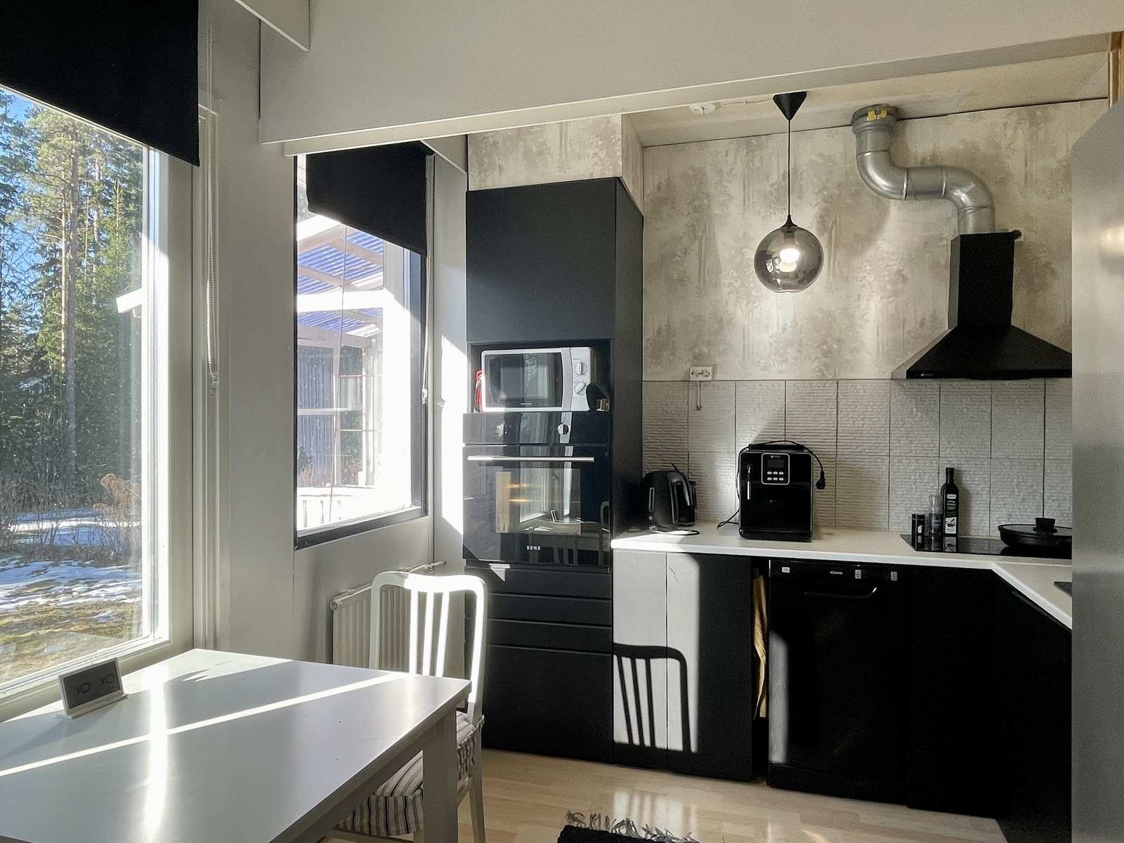 | Keittiön varustus | Muut varusteet: liesituuletin, astianpesukone, irralliset kaapistot Tasot: laminaatti Seinät: maalattu Lattia: laminaatti Liesi/uuni: erillisuuni, liesitaso |
