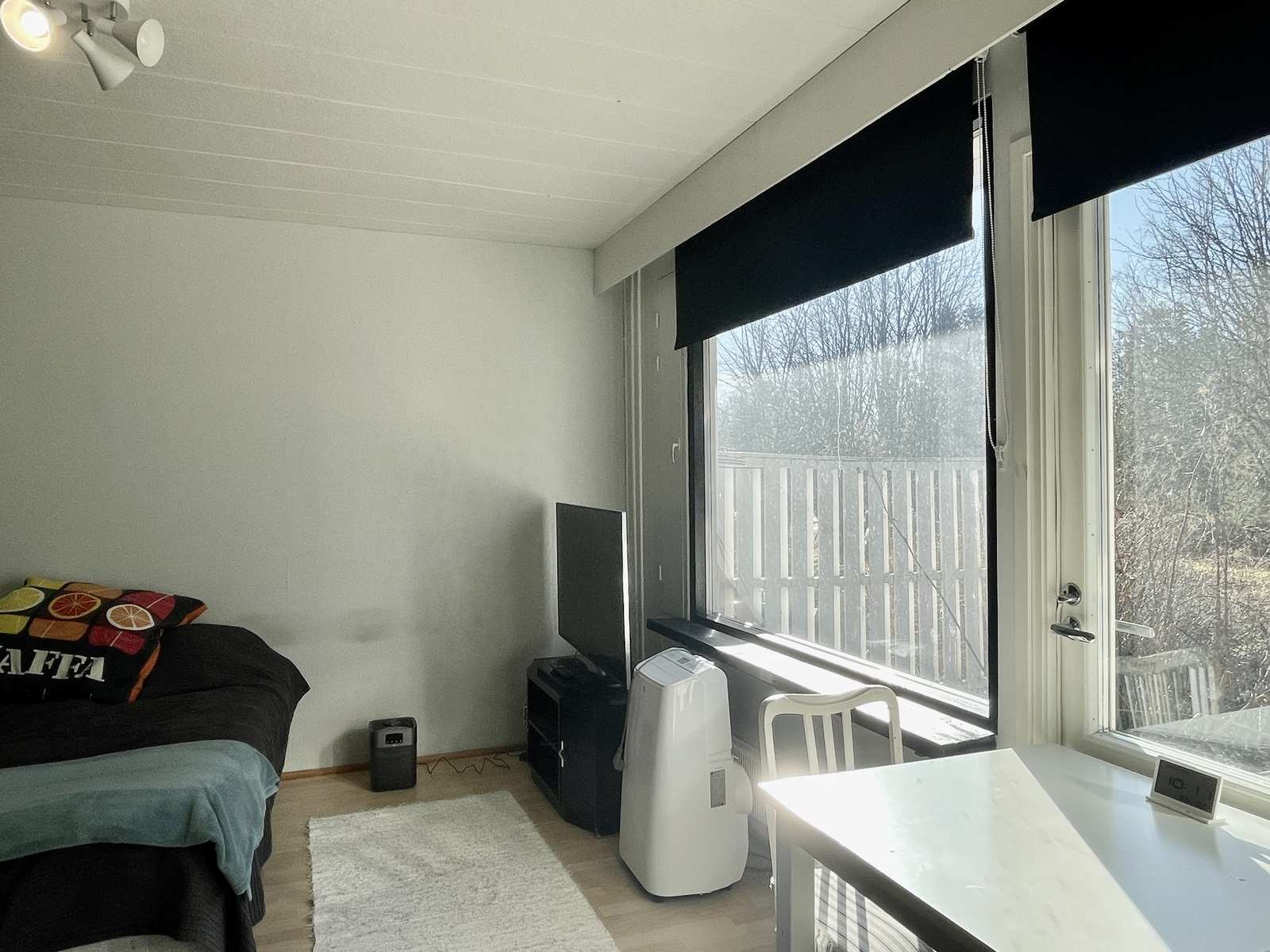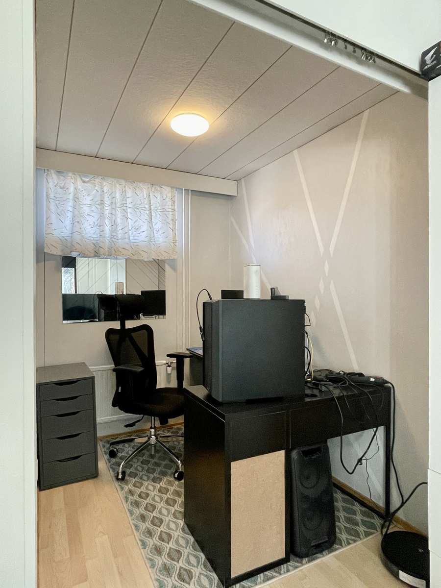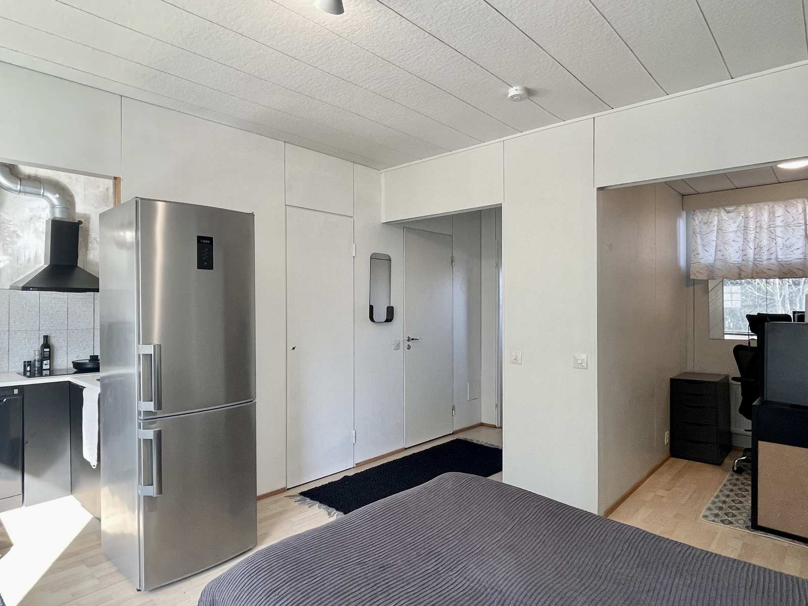 | Olohuone | Asuinhuoneen yhteydessä alkovi, jossa maalatut seinät ja pieni yläikkuna etupihan puolelle. Seinät: maalattu Lattia: laminaatti |