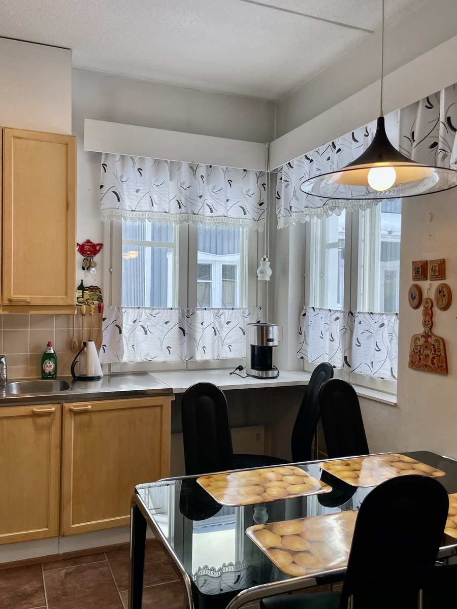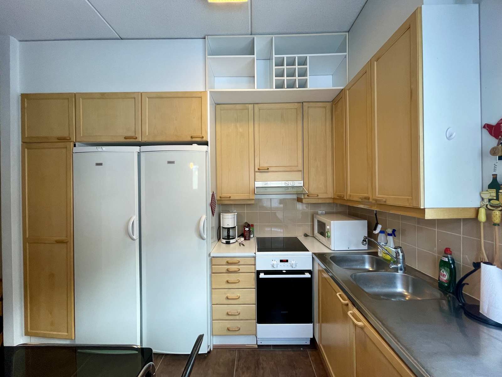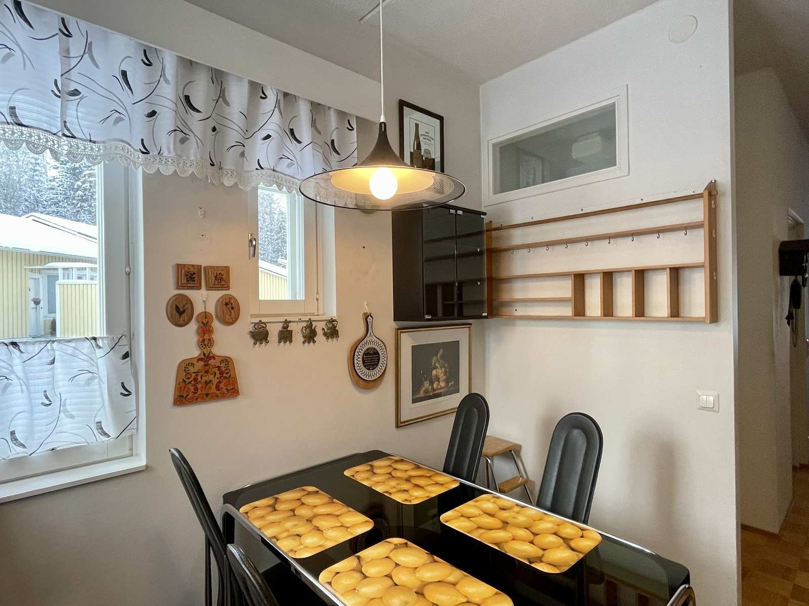 | Keittiön varustus | Jääkaappi ja pakastin: jääkaappi, pakastekaappi Tasot: laminaatti Seinät: maalattu Lattia: muovi Muut varusteet: liesituuletin, irralliset kaapistot, kiinteät valaisimet Liesi/uuni: sähköliesi |