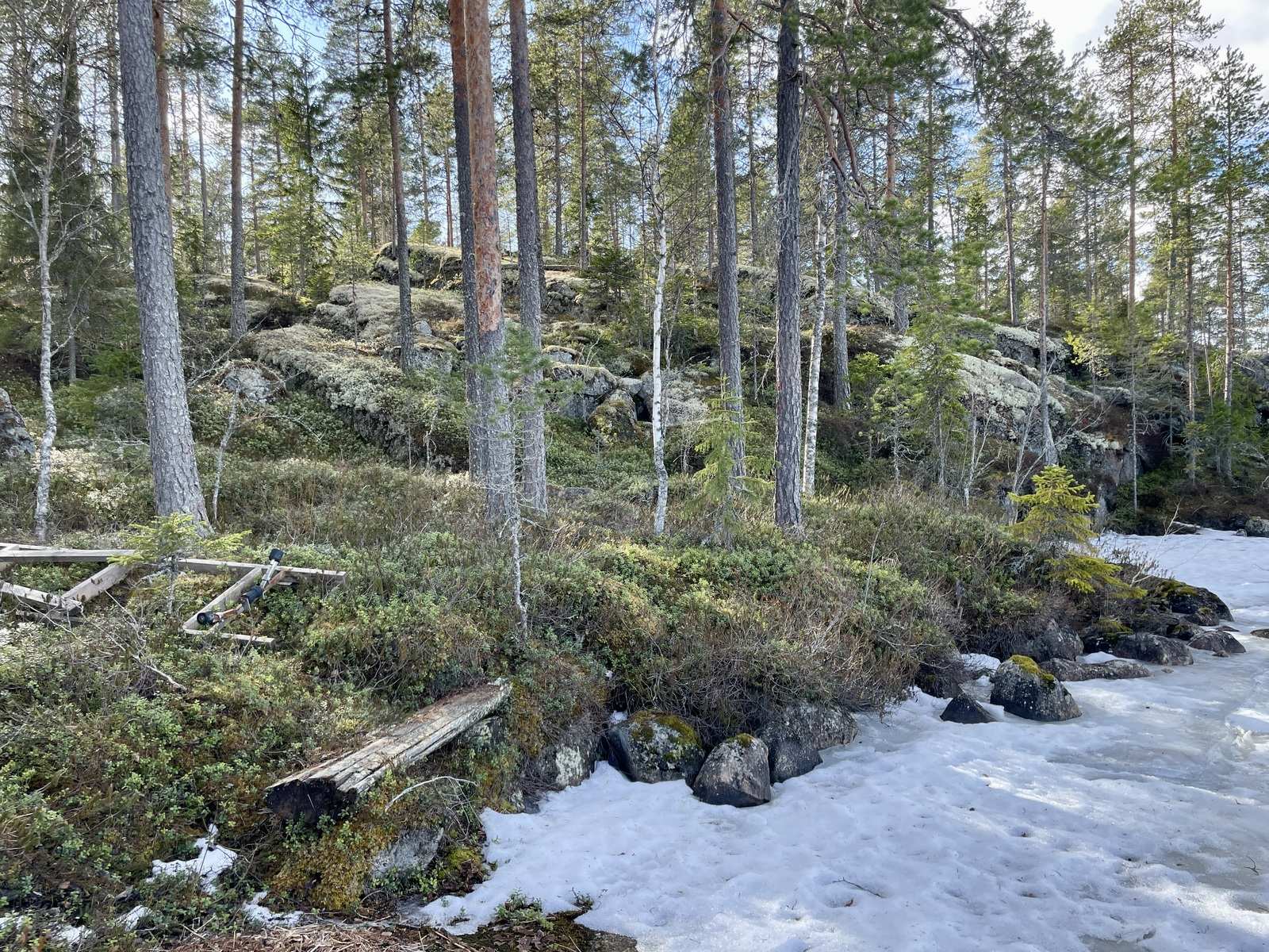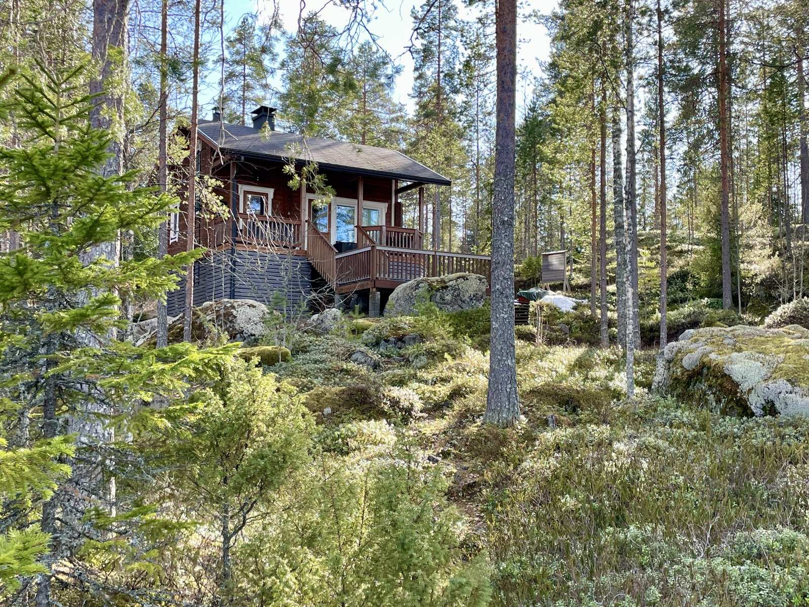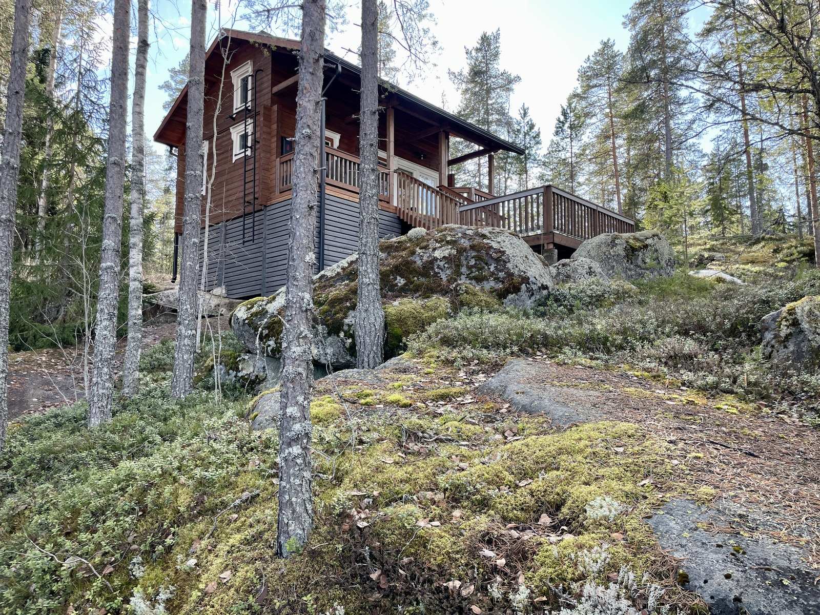 Ähtärissä Hankaveden rannalla myytävänä saunamökki upealla, kallioisella rinnetontilla.