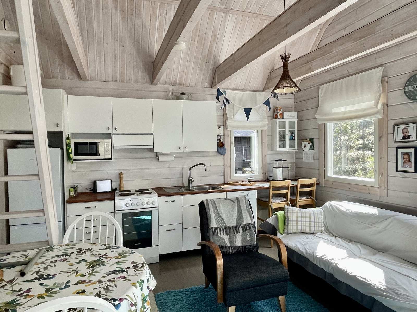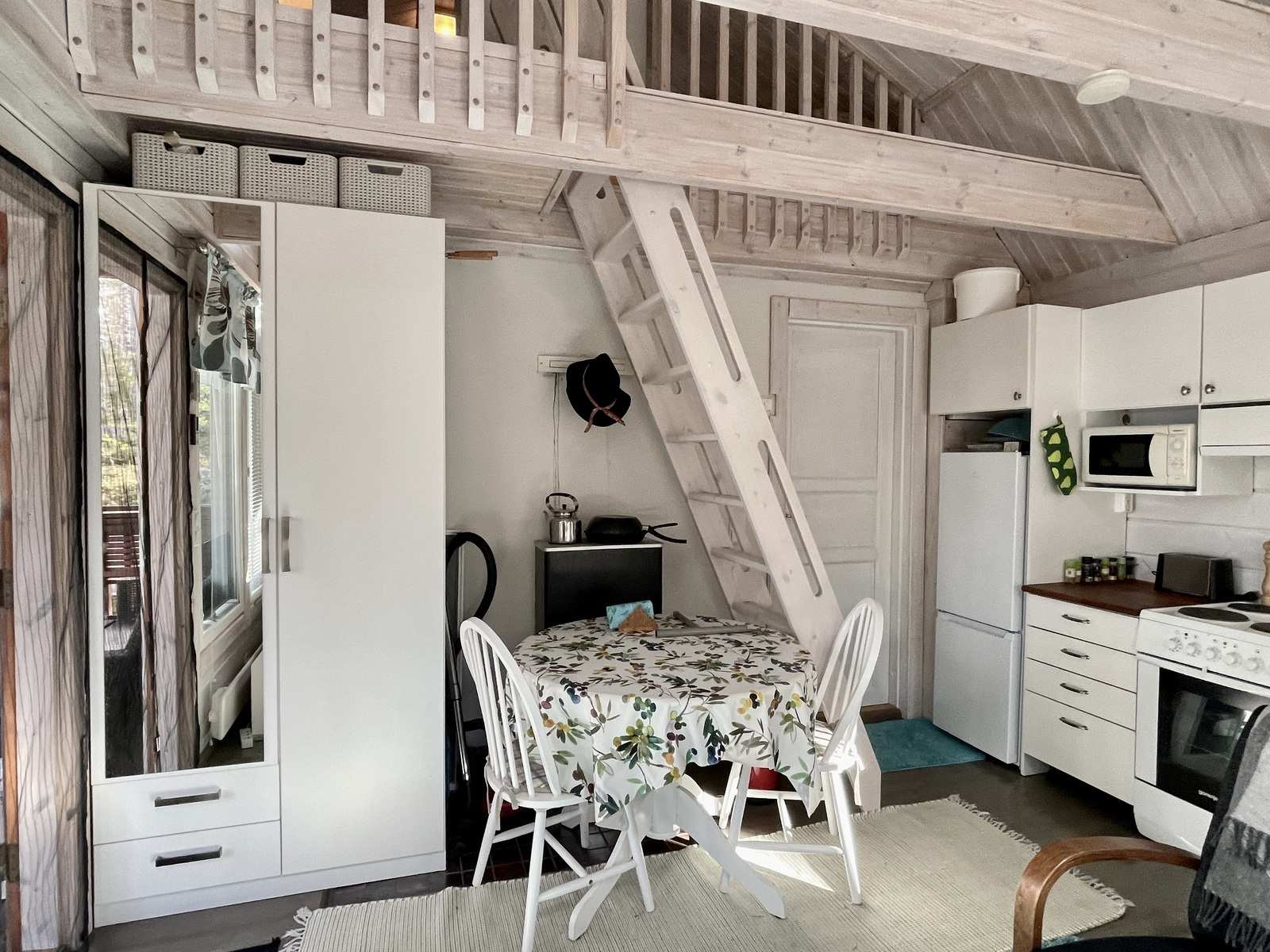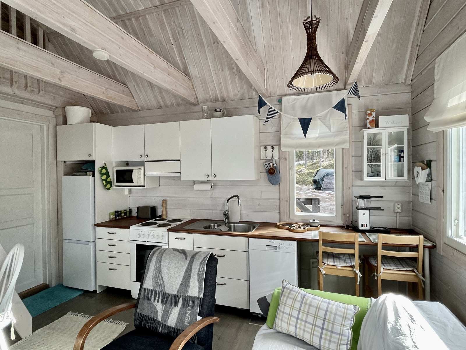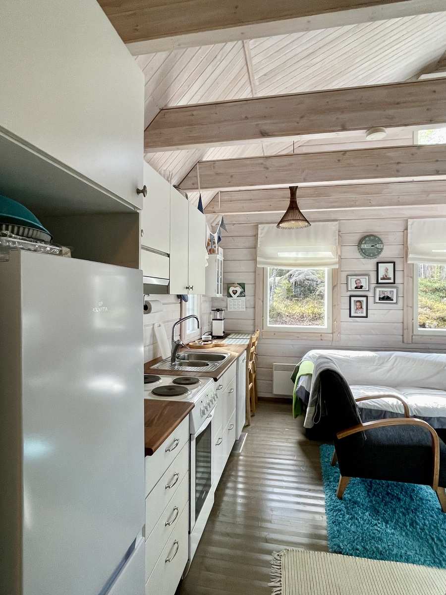 | Keittiön varustus | Jääkaappi ja pakastin: jääkaappi/pakastin Muut varusteet: astianpesukone, irralliset kaapistot, kiinteät valaisimet, liesituuletin / suodatin Tasot: puu Seinät: puu Lattia: lauta Liesi/uuni: sähköliesi |