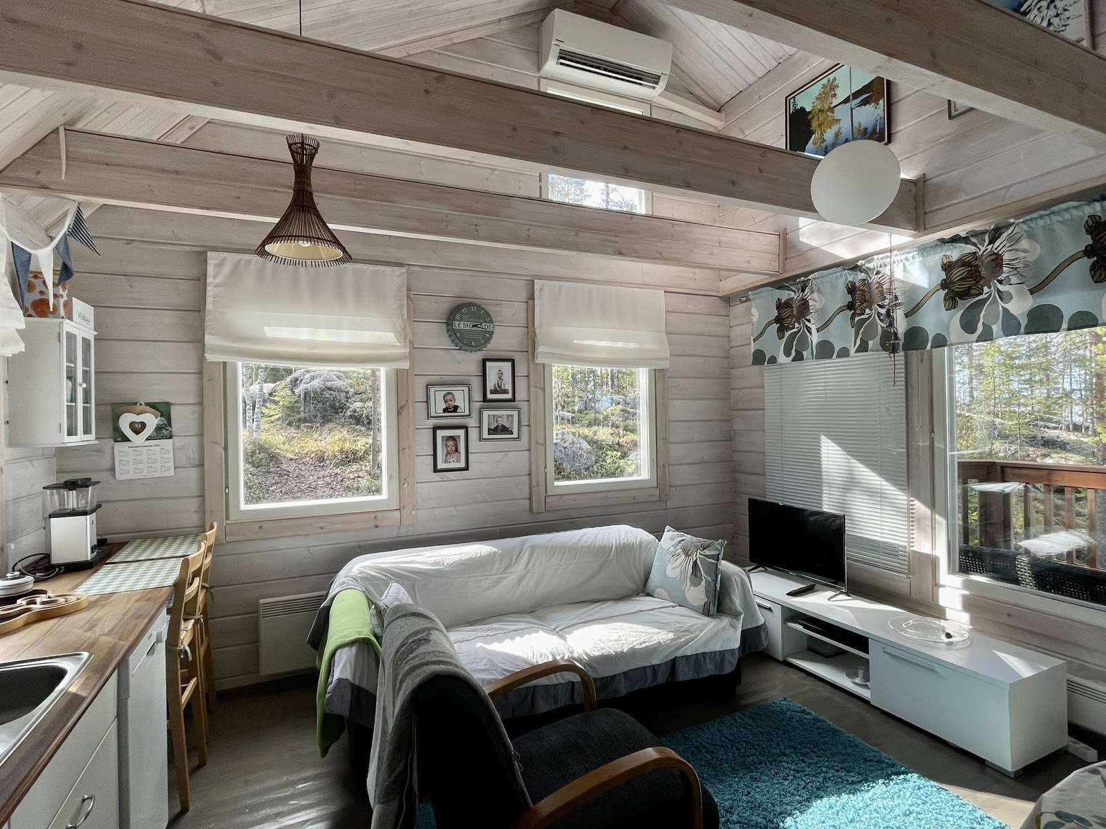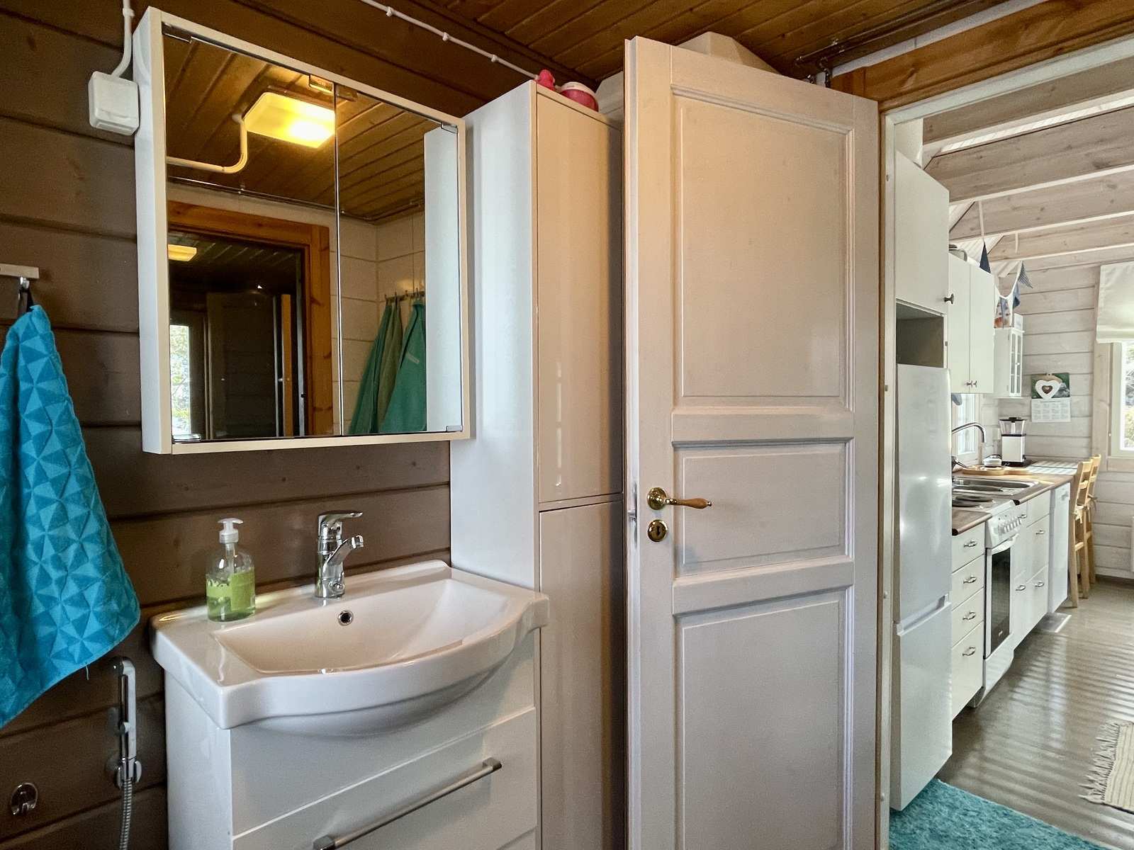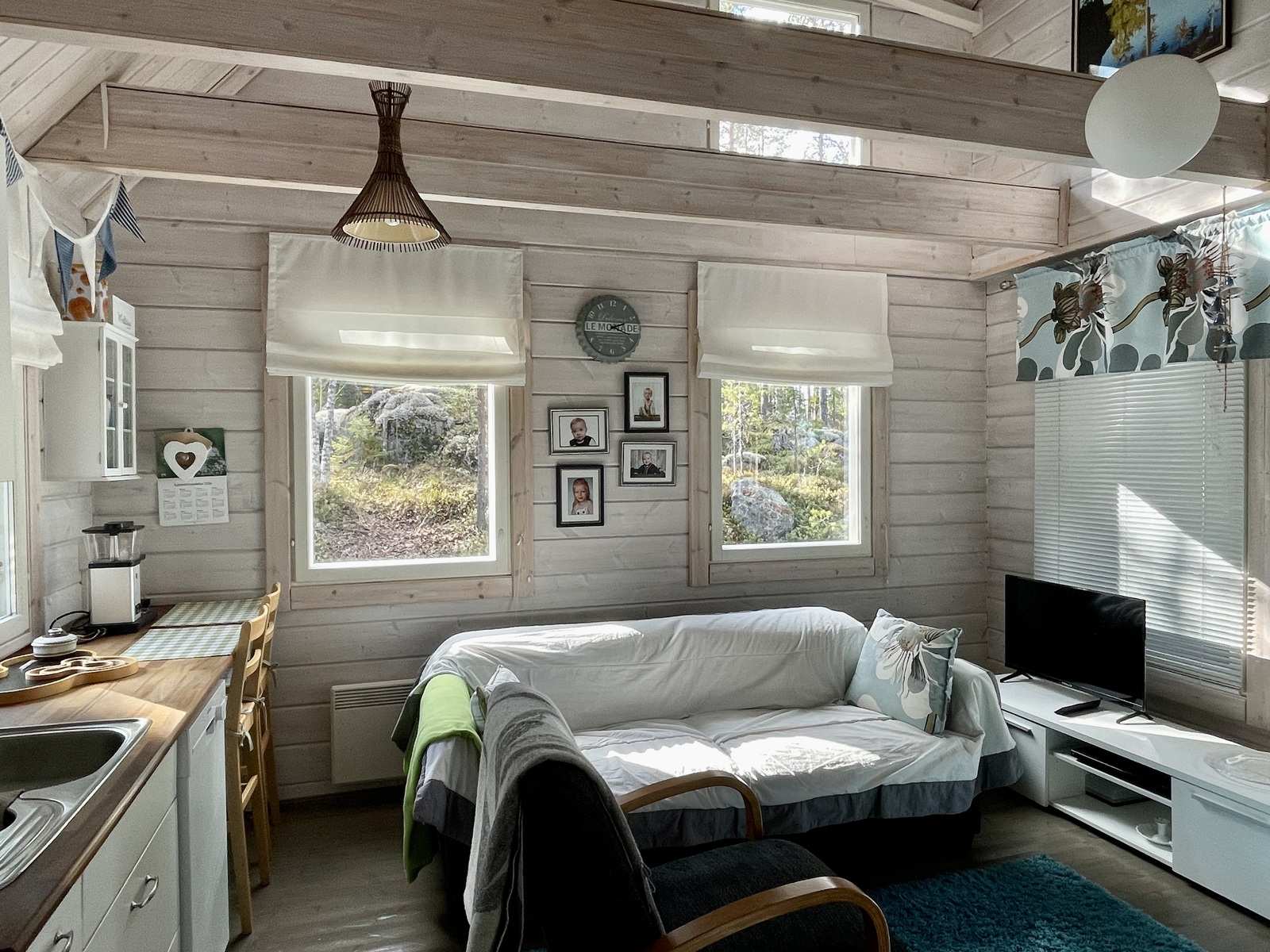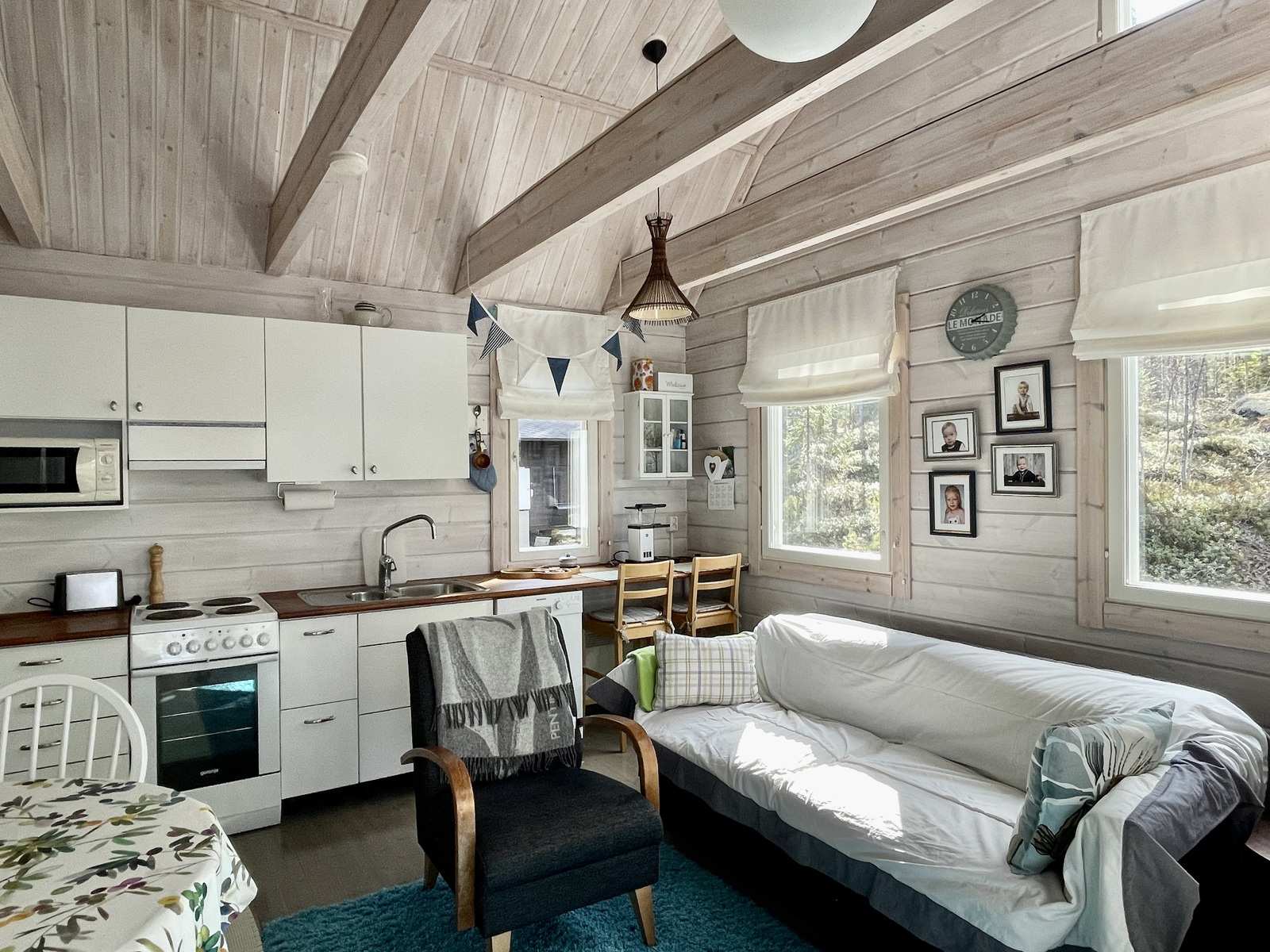 | Keittiön varustus | Jääkaappi ja pakastin: jääkaappi/pakastin Muut varusteet: astianpesukone, irralliset kaapistot, kiinteät valaisimet, liesituuletin / suodatin Tasot: puu Seinät: puu Lattia: lauta Liesi/uuni: sähköliesi |
