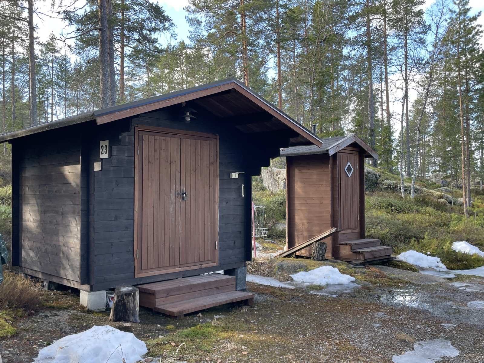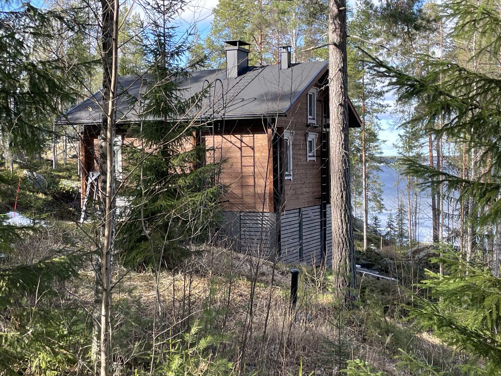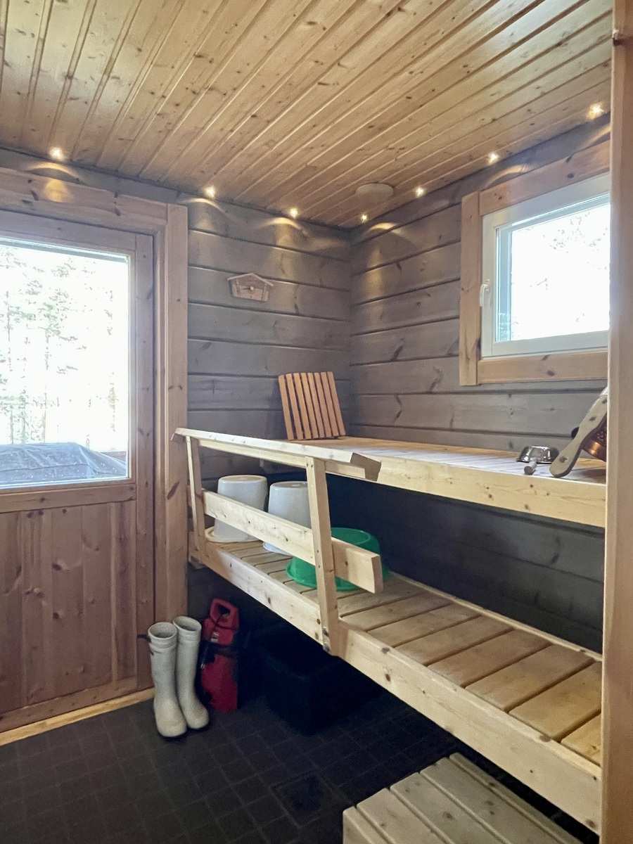 | Lisätietoja pinta-alasta | Saunamökin kerrosala on noin 30,5 m2 ja asuinala noin 26,1 m2, parvella lattiapinta-alaa noin 11,5 m2. Lisäksi terassi 13,8 m2 ja muutamaa porrasta alempana lisää terassia. Varaston pinta-ala on noin 6 m2 ja puucee noin 1,2 m2. Lisäksi liiteri. |