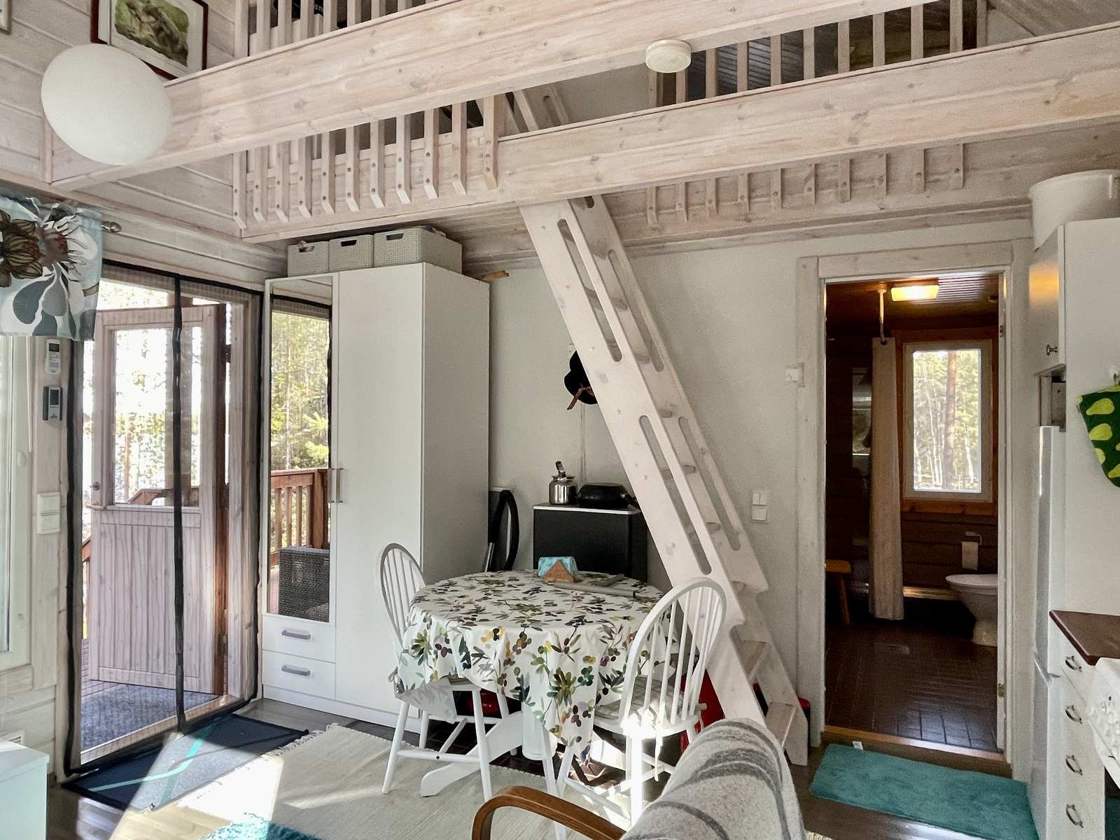 | Kylpyhuone | Varusteet: suihkuseinä, lattialämmitys, wc-istuin, suihku, peilikaappi, kiinteät valaisimet Seinät: puu Lattia: laatta |
