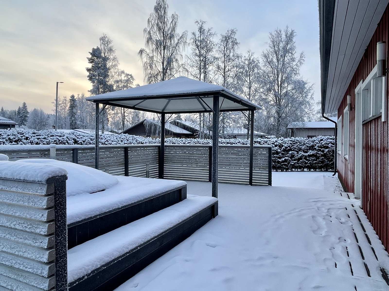 Olohuone ja keittiö ovat avointa tilaa ja keittiössä on silti runsaasti kaappitilaa. Tuulikaappi on purettu pois, mikä tekee myös eteisestä avaramman. Pesuhuoneen / kodinhoitohuoneen, saunan ja wc:n alueelta on lattiat purettu ja asennettu vesikiertoinen lattialämmitys. Tilajärjestys on samalla muutettu avarammaksi purkamalla vanha vaatehuone pois. Kaikki sisäseinät on uusittu ja lattiat tasoitettu. Takapihalla on iso terassi oleskeluun. Terassilla oleva kylpytynnyri ja katettu paviljonki sisältyvät kauppaan. Talon toisessa päädyssä on tekninen tila ja varastotilat. Vuonna 2005 pihaan on rakennettu autokatos. Kuntotarkastus on tehty 12/2025. Talossa ei havaittu normaalista poikkeavia kosteuksia eikä merkittäviä remonttitarpeita.