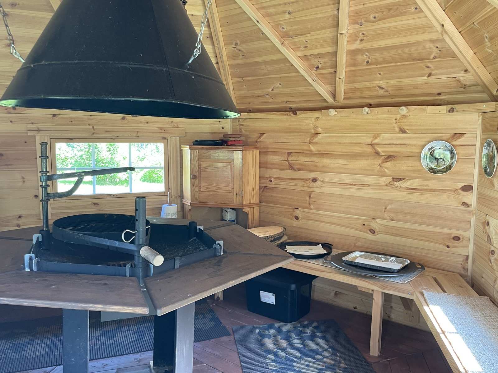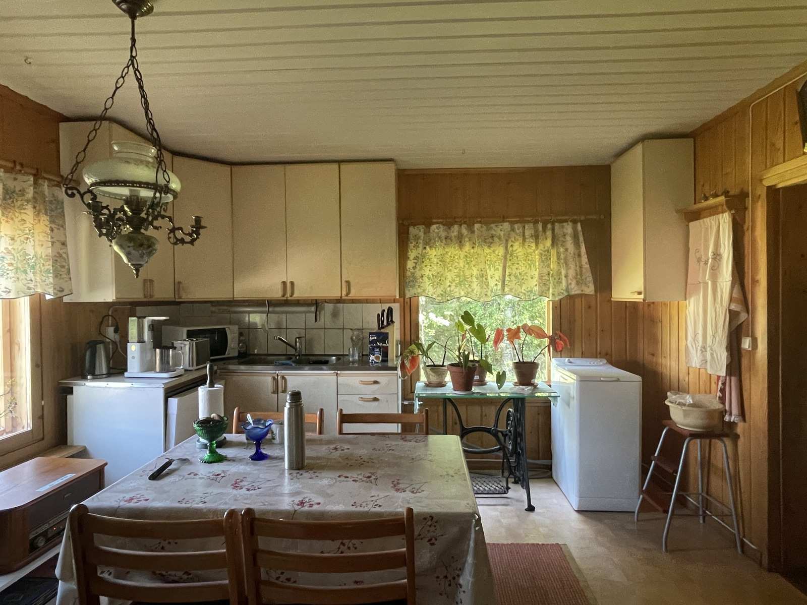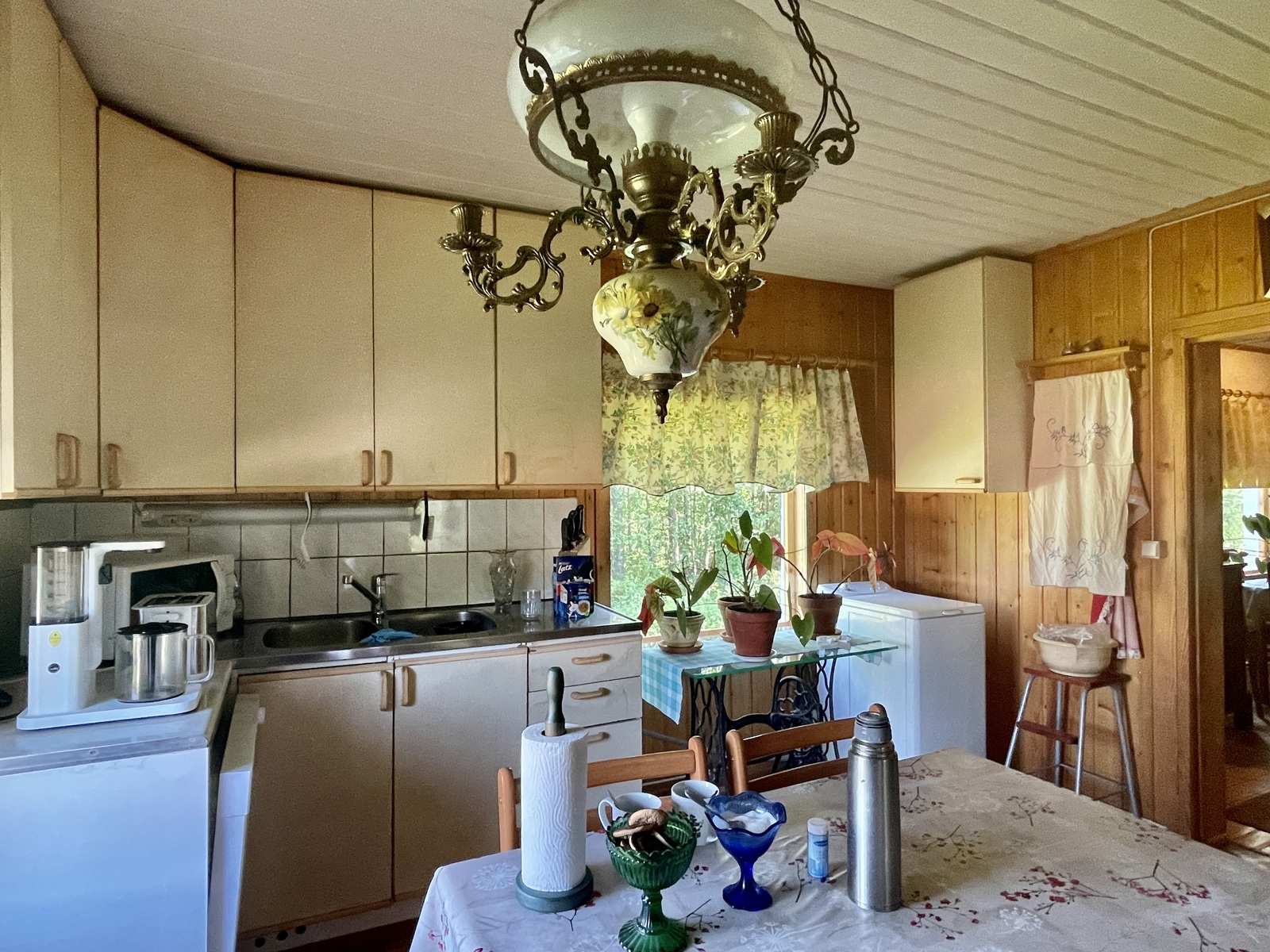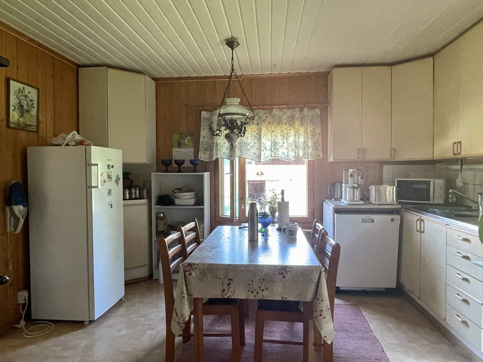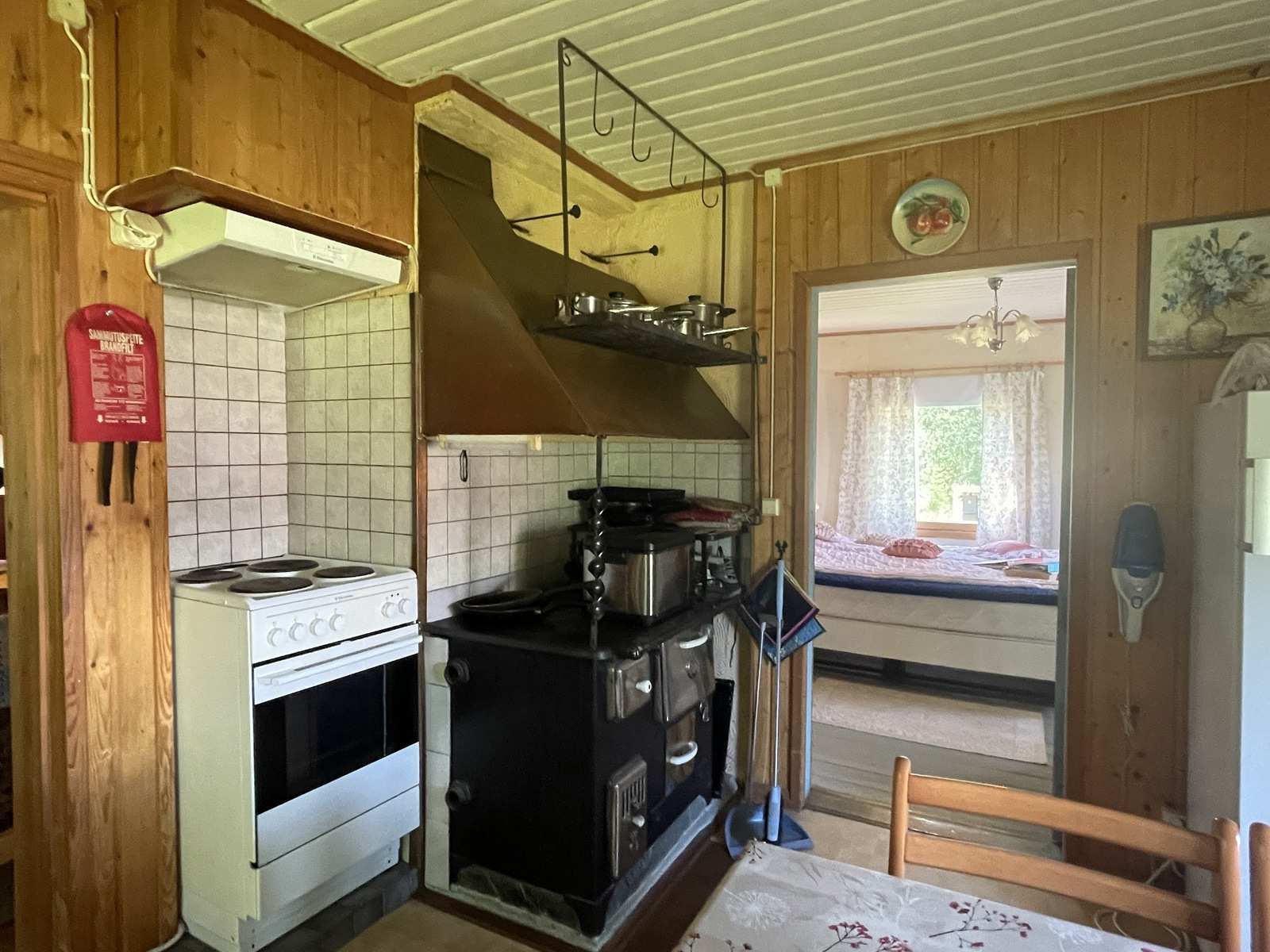 Keittiön varustus | Jääkaappi ja pakastin: jääkaappi, pakastin Muut varusteet: liesituuletin, mikroaaltouuni, astianpesukone, irralliset kaapistot, kiinteät valaisimet Seinät: puu Lattia: muovi Liesi/uuni: sähköliesi, leivinuuni, puuliesi |