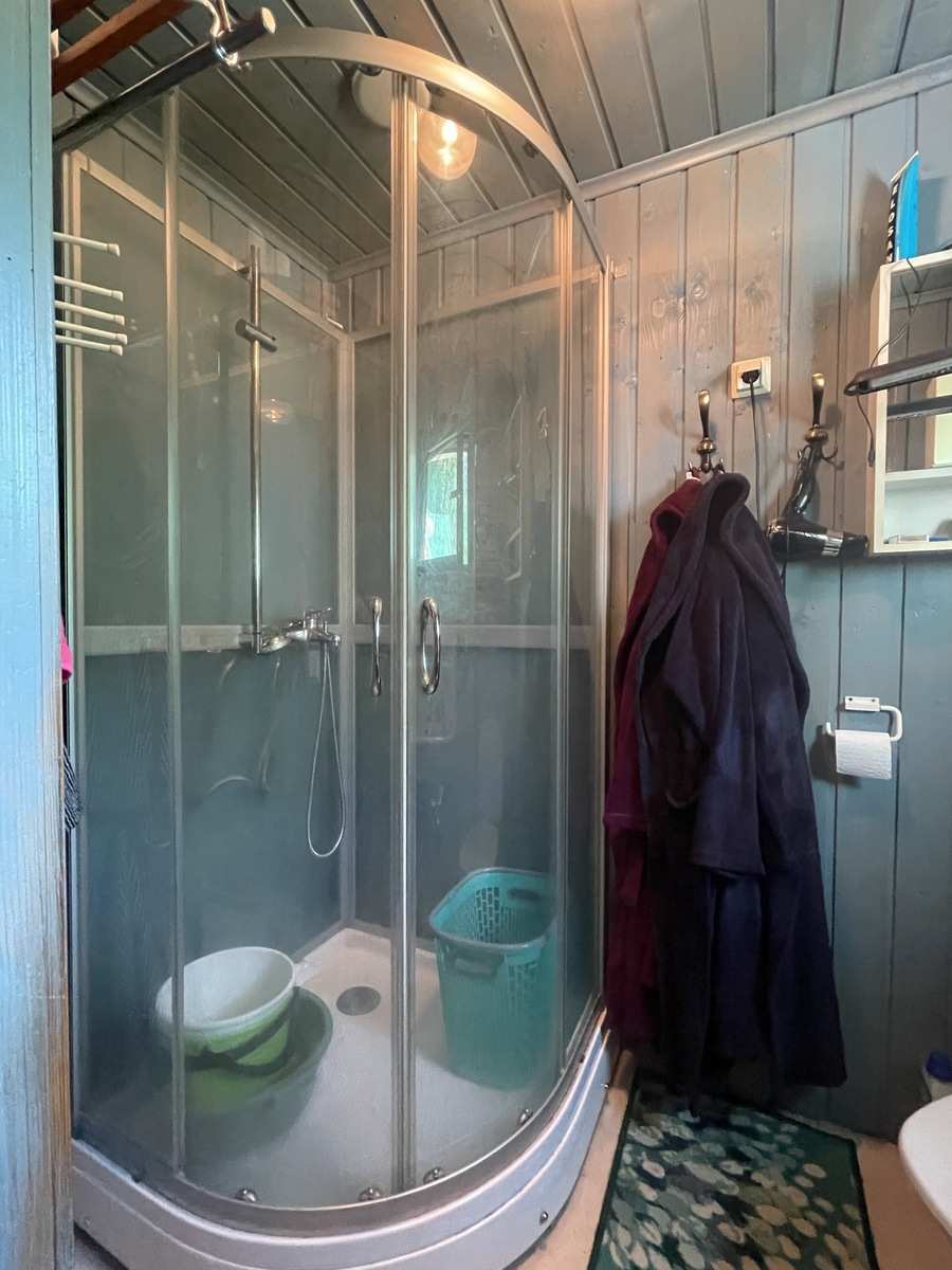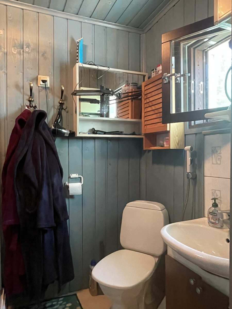 Erillinen WC | Wc / pesuhuoneessa wc-istuin, pesuallas, peilikaappi, suihkukappi. Lattia: muovi Varusteet: suihkukaappi, peilikaappi Seinät: puu Lukumäärä: 1 |