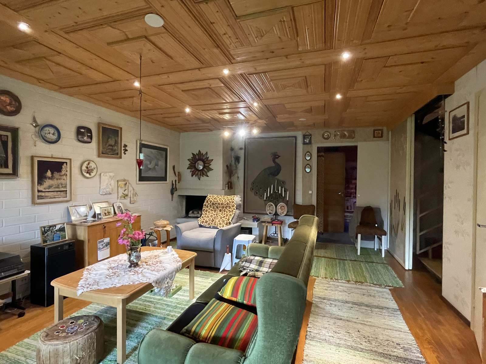 Tilojen kuvaus | Askarteluhuone: kokolattiamatto / puupaneeli Takkahuone: parketti / tapetti, tiili |
