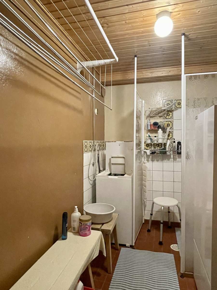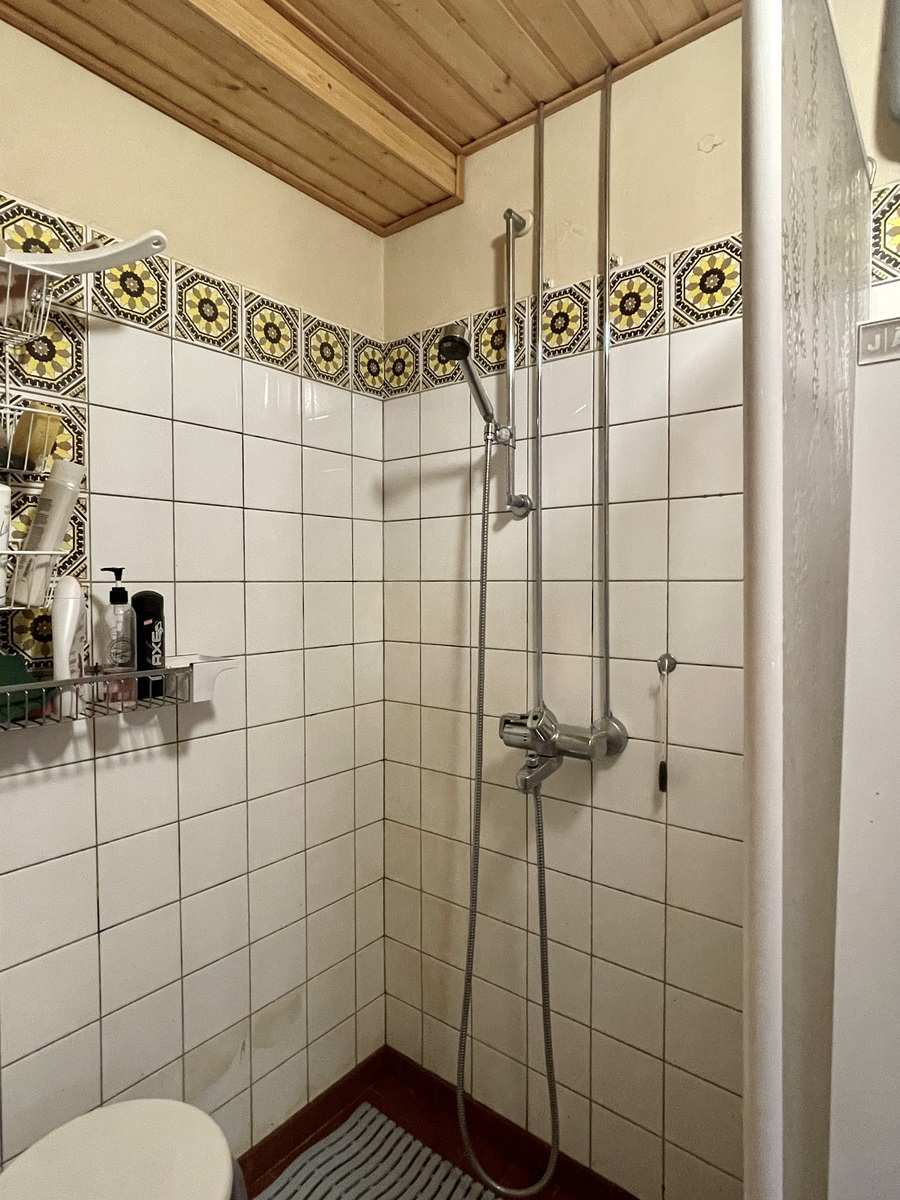 Kylpyhuone | Varusteet: pesukoneliitäntä, lattialämmitys, suihku, kiinteät valaisimet Seinät: kaakeli Lattia: laatta |