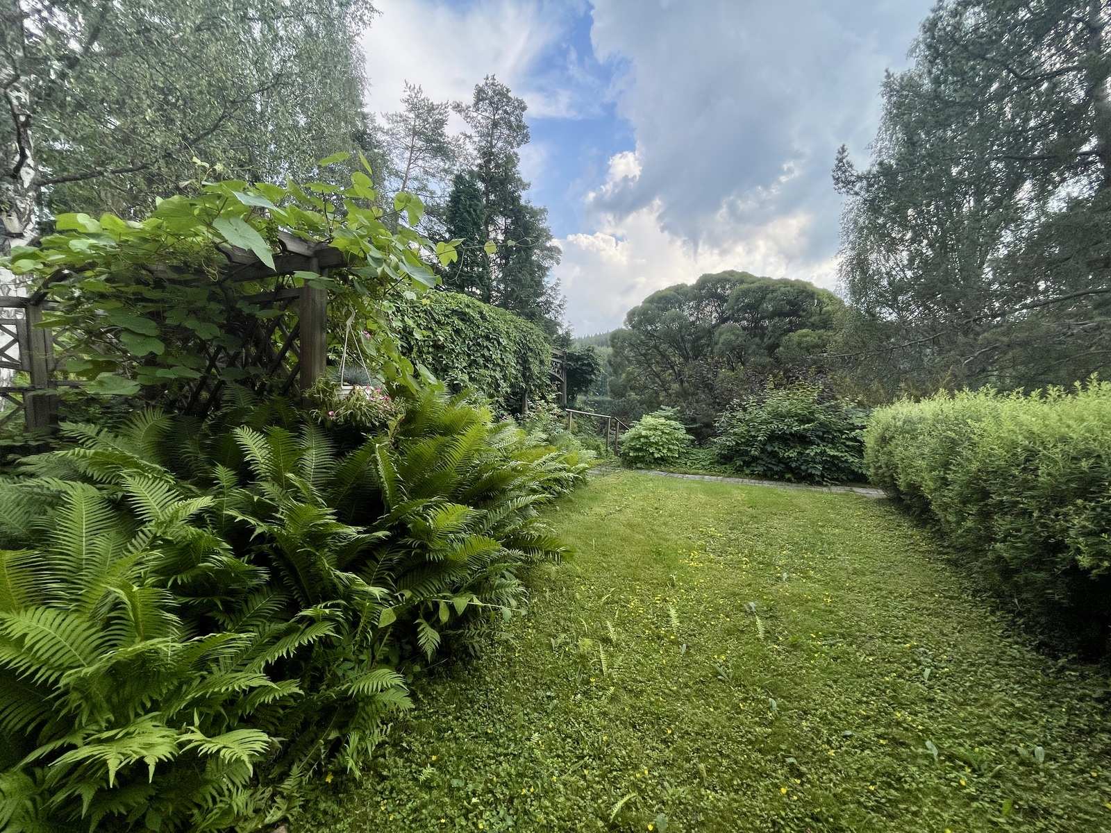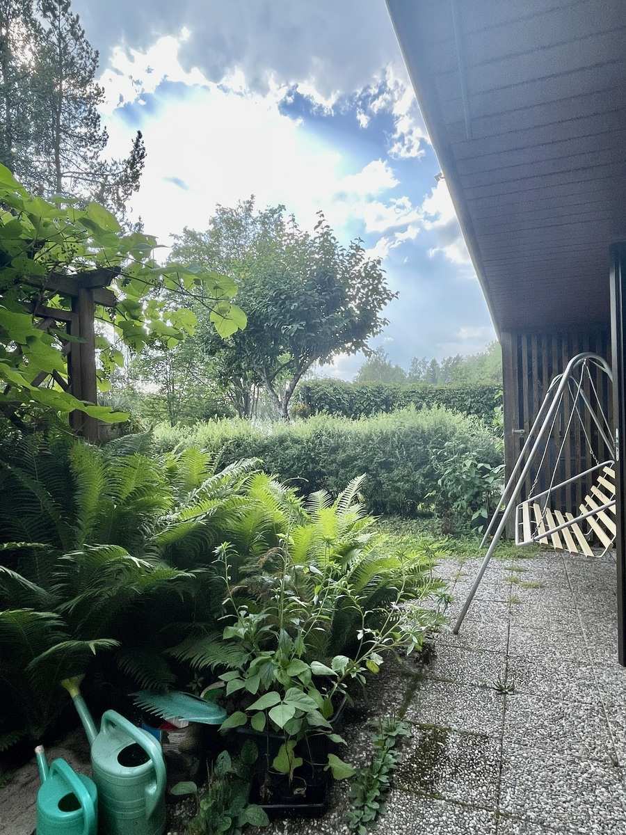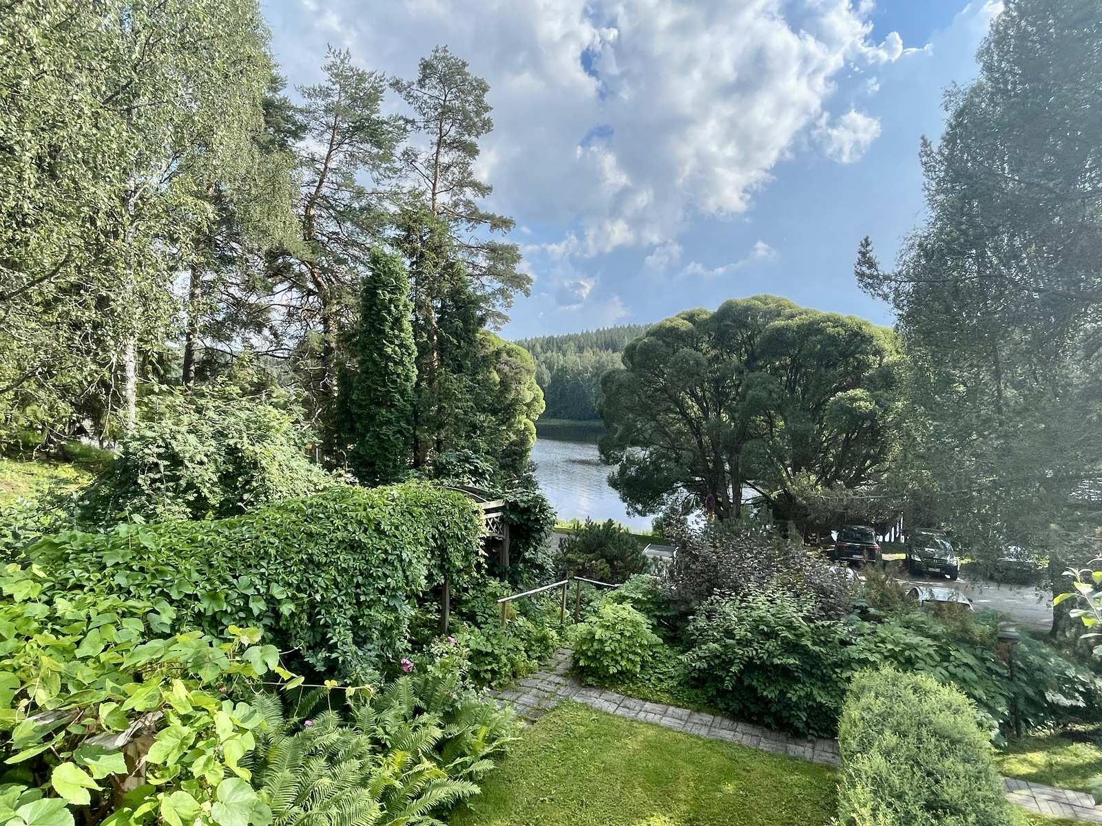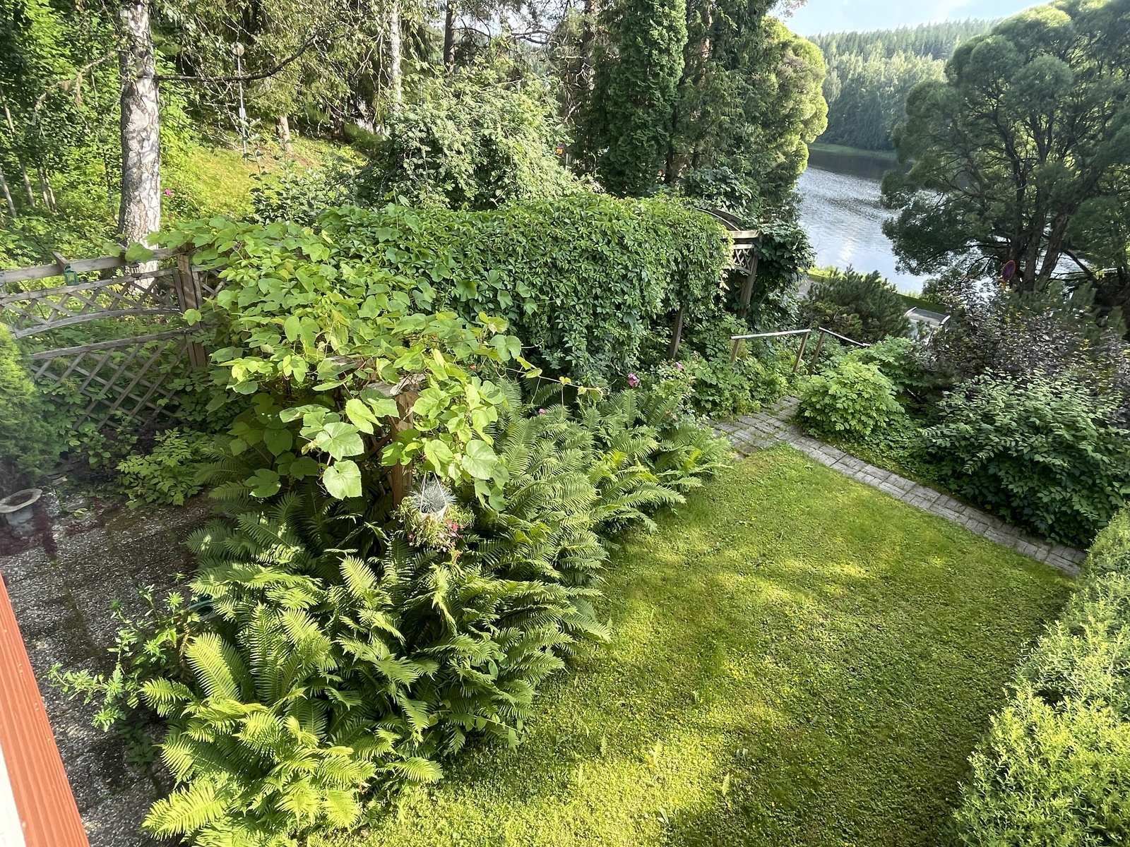 Maasto | Takapiha nurmikoitu ja pihalla on runsaasti istutuksia. Pihan ilmansuunta on etelään - lounaaseen järven suuntaan. |