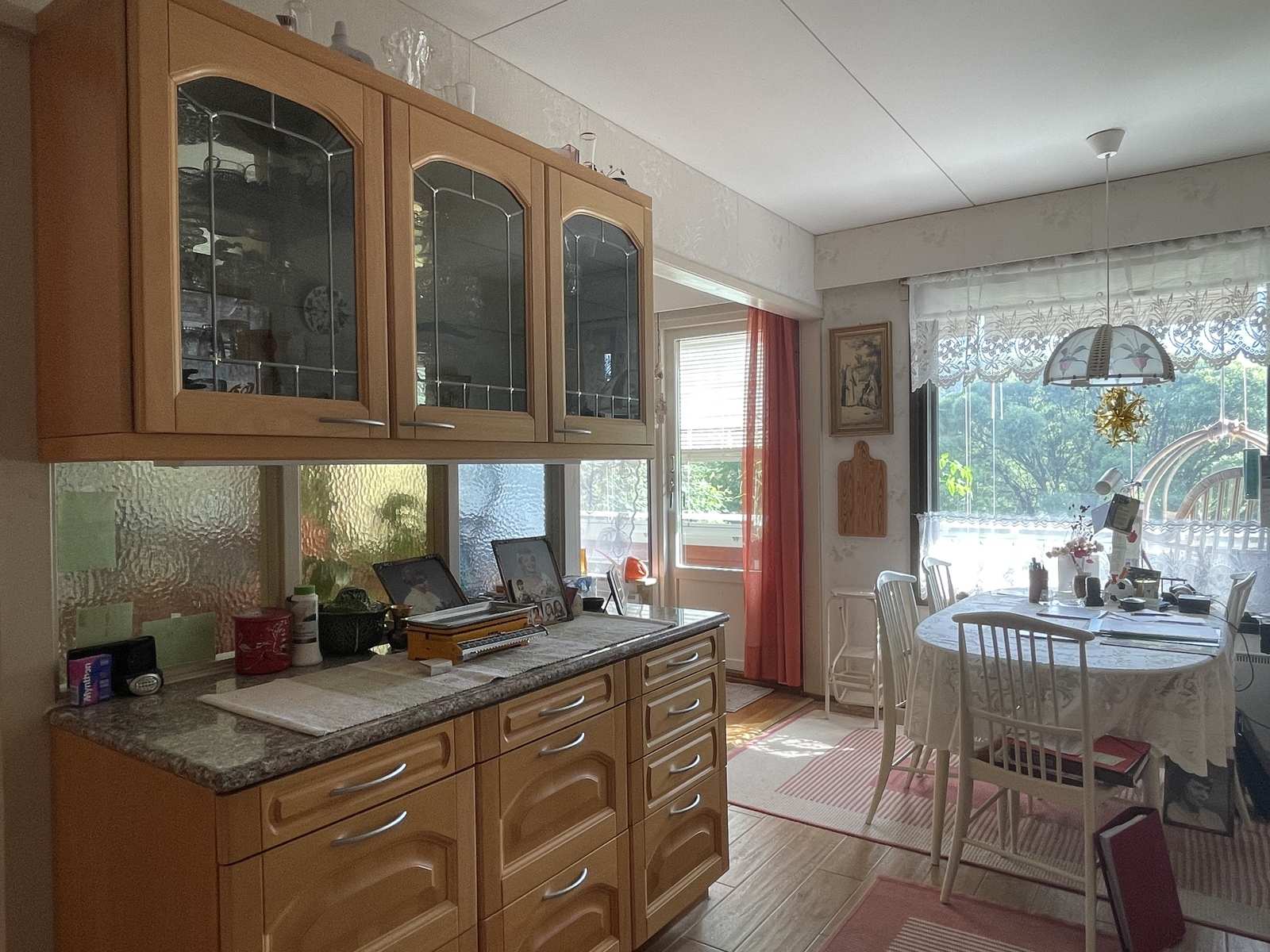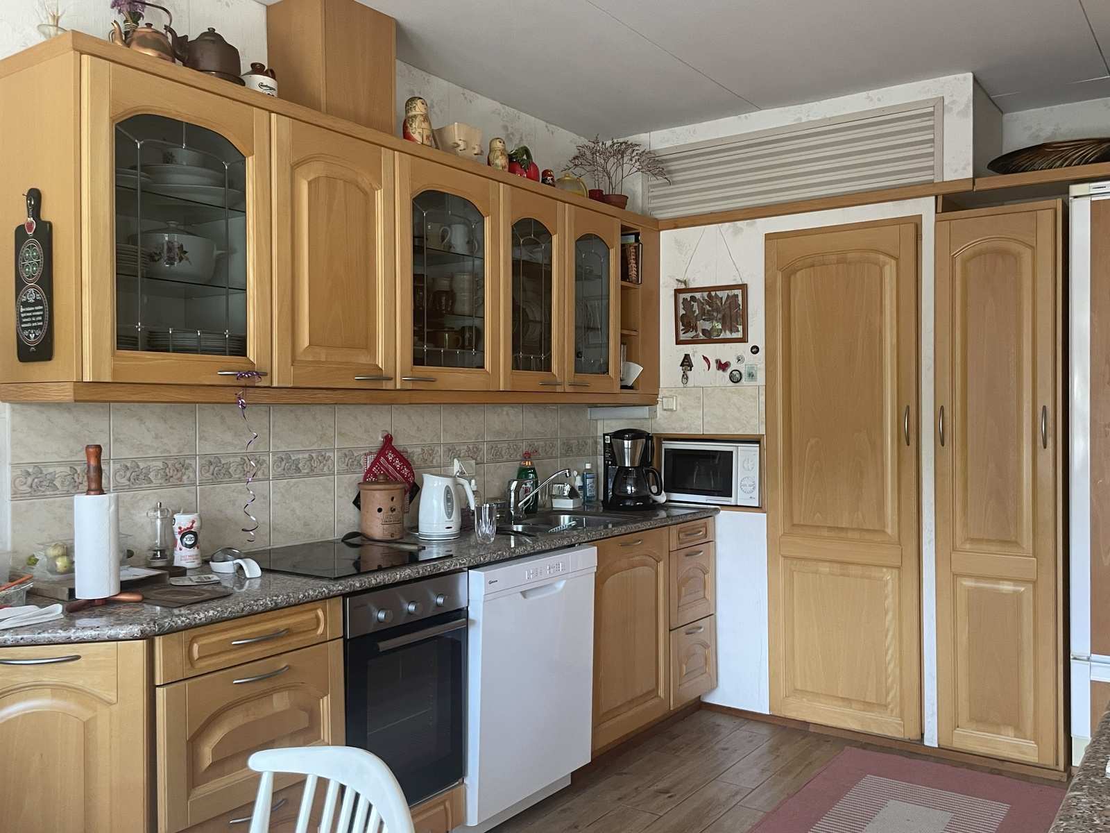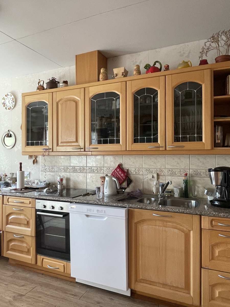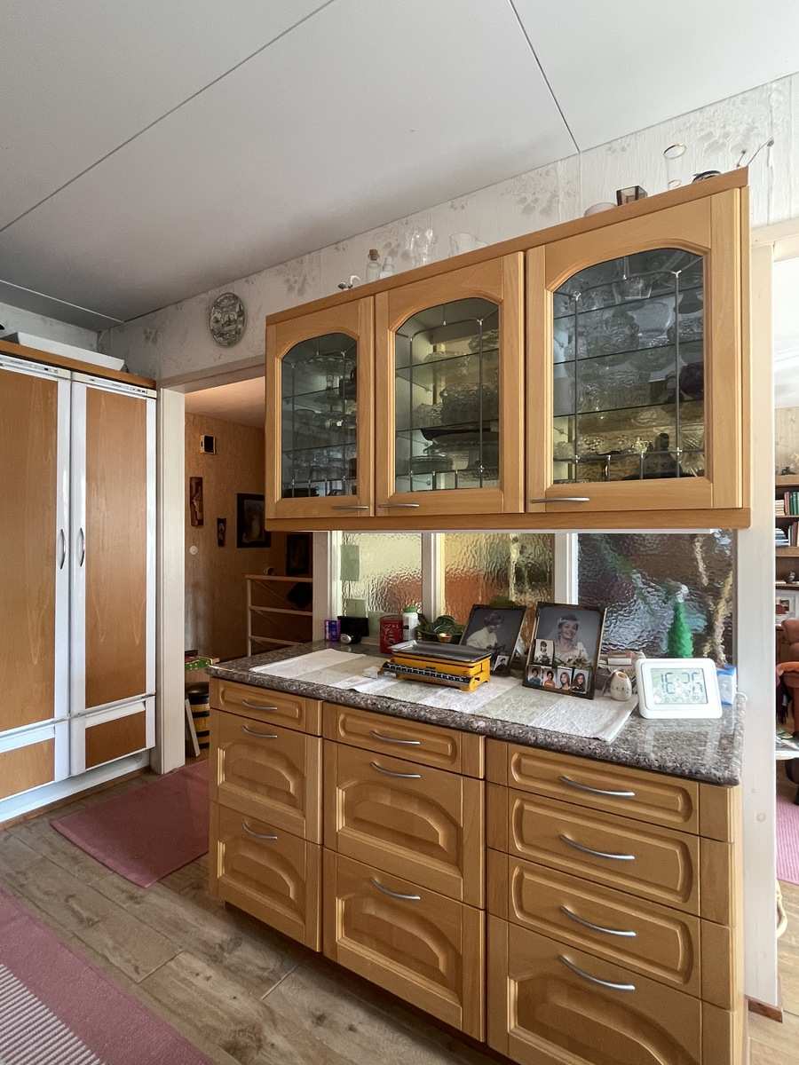 Keittiön varustus | Jääkaappi ja pakastin: jääkaappi, pakastin Tasot: kivi Seinät: tapetti Lattia: laatta Muut varusteet: liesituuletin, irralliset kaapistot, kiinteät valaisimet Liesi/uuni: keraaminen, erillisuuni |