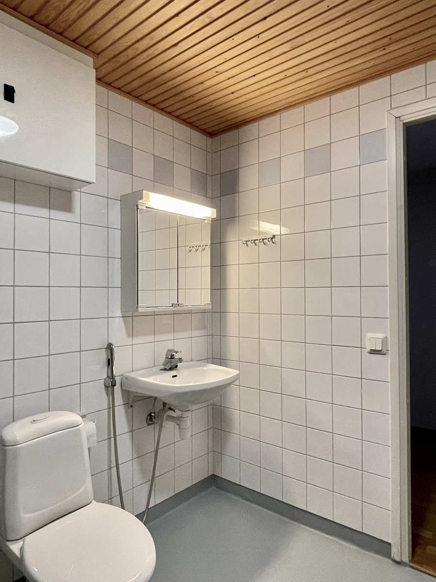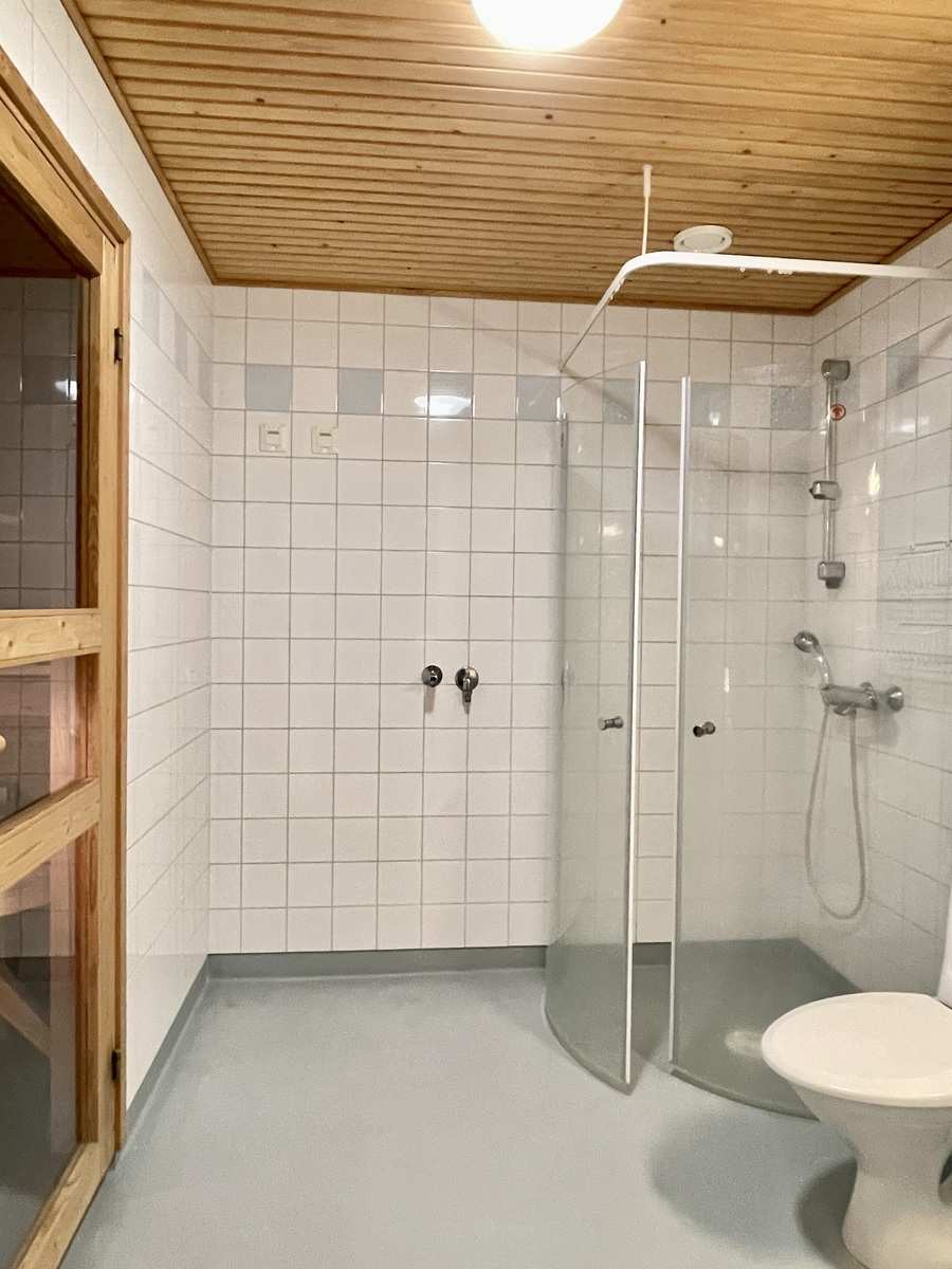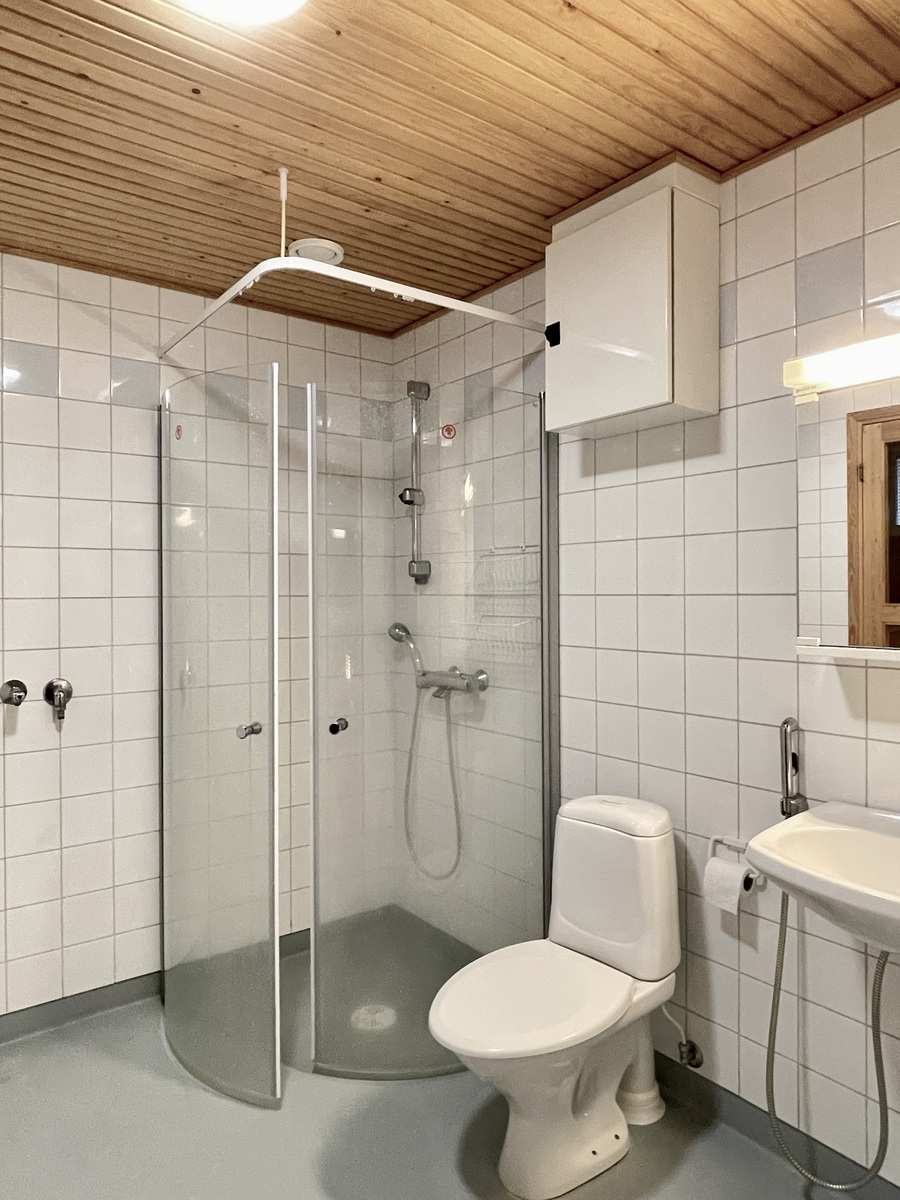 | Kylpyhuone | Varusteet: suihkuseinä, pesukoneliitäntä, lattialämmitys, wc-istuin, suihku, peilikaappi, kiinteät valaisimet Seinät: kaakeli Lattia: muovi |