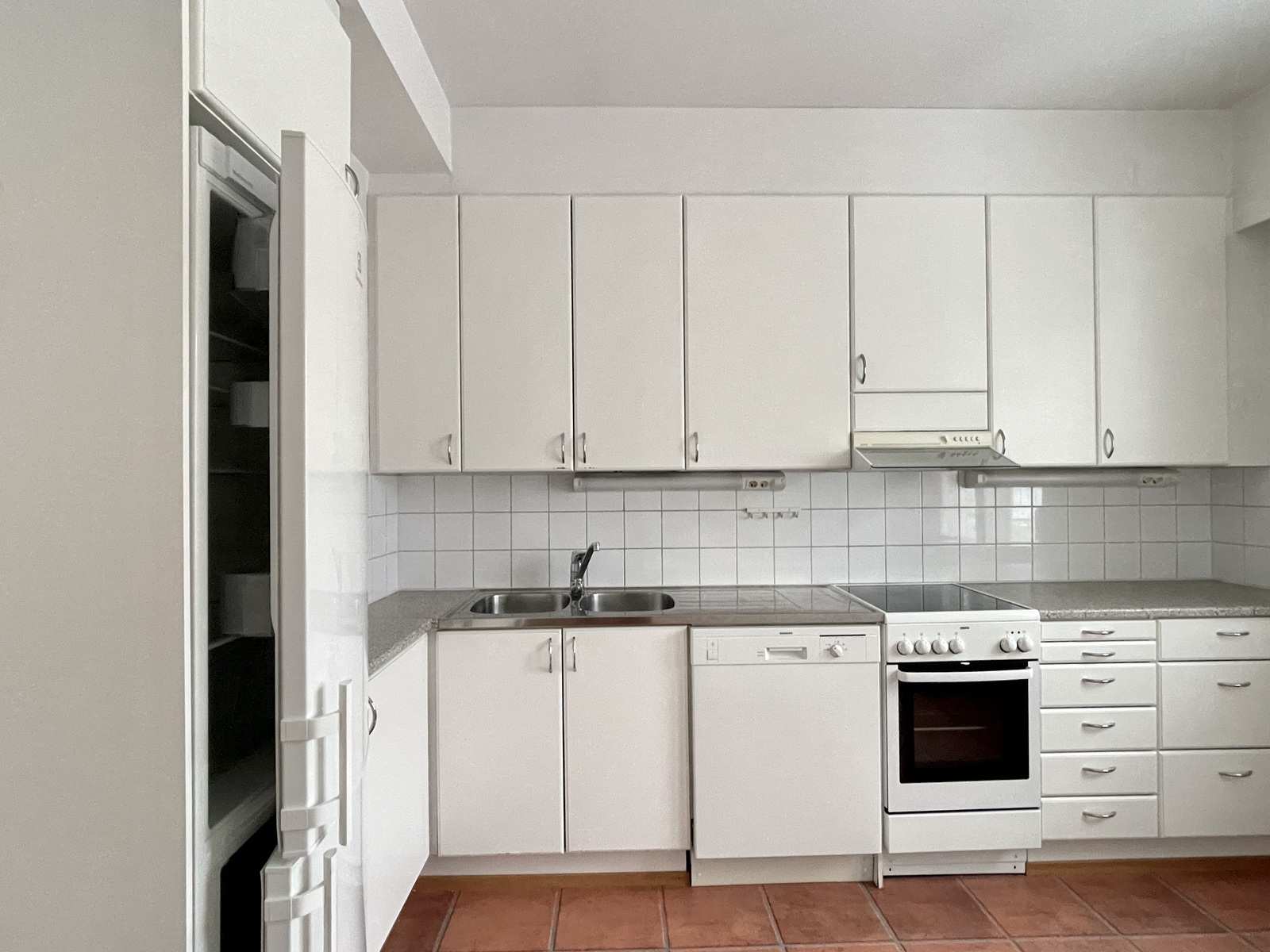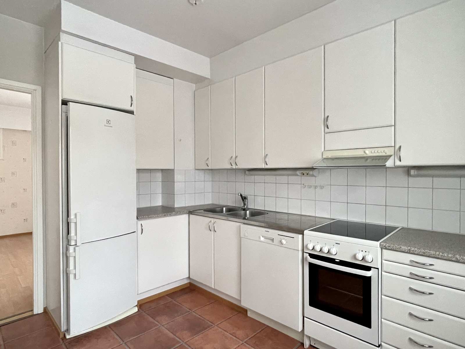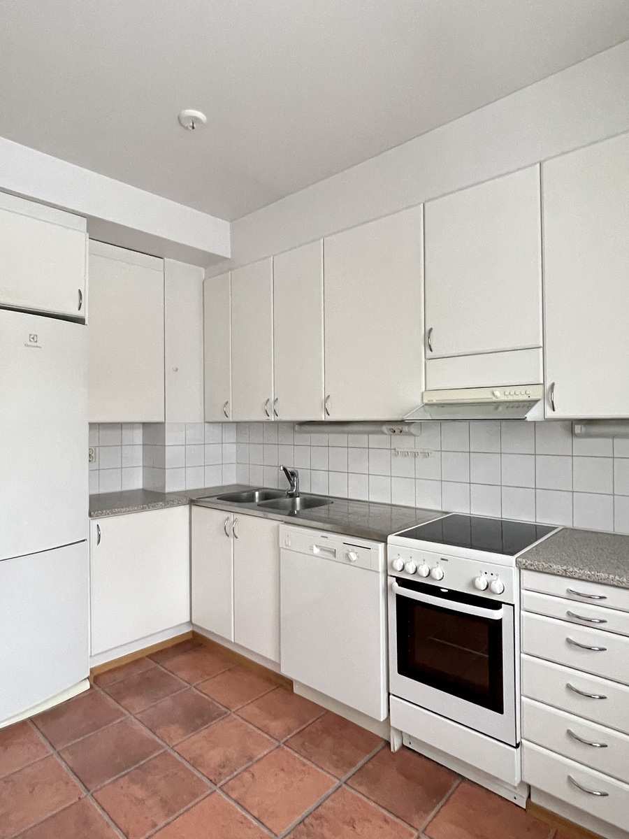 | Keittiön varustus | Jääkaappi ja pakastin: jääkaappi/pakastin Tasot: laminaatti Seinät: maalattu Lattia: muovi Muut varusteet: liesituuletin, astianpesukone, irralliset kaapistot, kiinteät valaisimet Liesi/uuni: keraaminen |