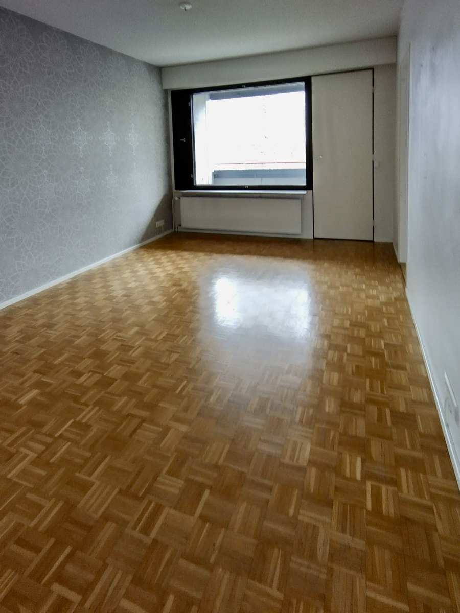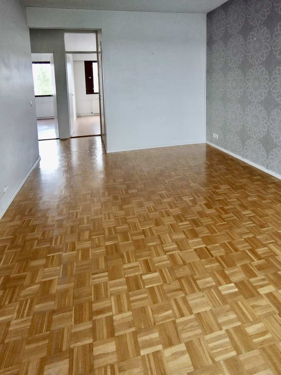 Olohuone | Olohuoneessa parkettilattia, seinät tapetoitu. |